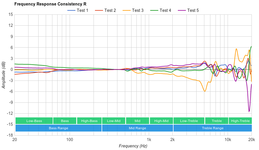 Good Consistency performance. Unlike the closed-back RS 165 and RS 175 that perform quite poorly in terms of Bass Range consistency, the open-back RS 185 shows only 4dB of variance at 20Hz across our 5 human subjects, which is good. They also have a decent consistency in their Treble Range performance.