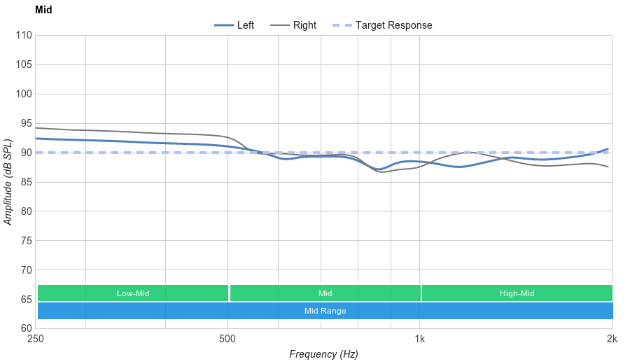 Very good Mid Range performance. The only remark here is the slight bump in low-mid, which is the continuation of the high-bass overemphasis, adding a bit of a muddy quality to the reproduction.