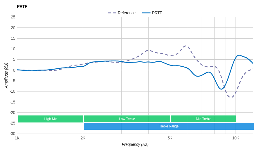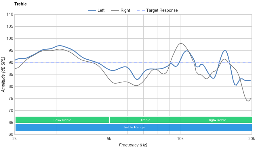 Decent Treble Range performance. Low-treble is overemphasized by about 5dB which makes these headphones slightly bright and forward sounding. The dip in treble has a subtle negative effect on the detail and articulation of vocals/leads and the peak around 10KHz could make these headphones a bit sharp on overly-bright tracks.