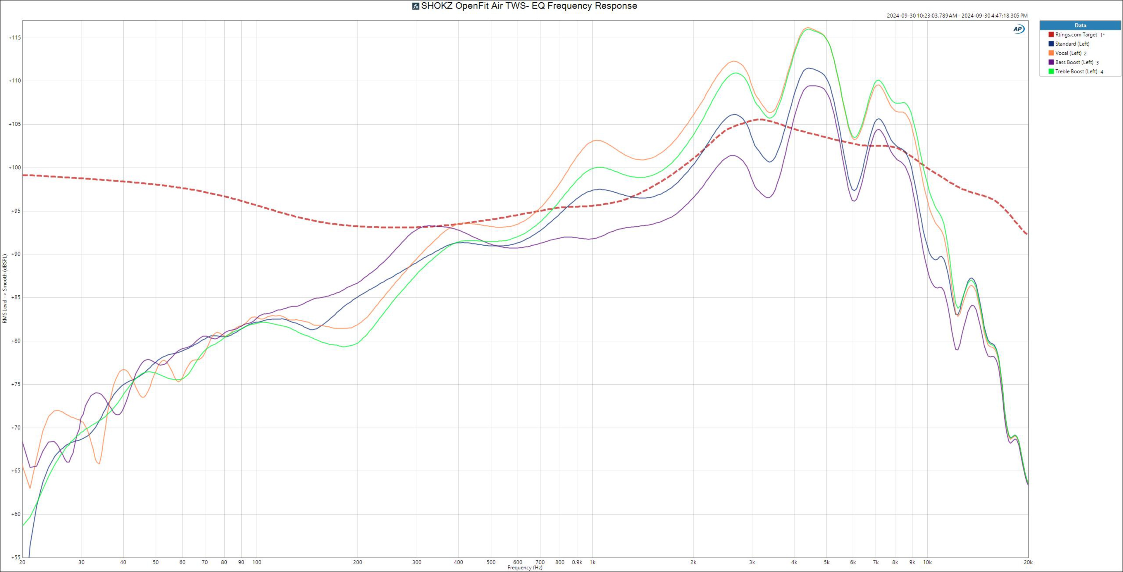 The bass profile target compliance is awful, but that's to be expected from earbuds that don't go into your inner ear at all. They produce almost no audible low-bass, and the mid-bass is also drastically reduced. If you need to feel the thump of a kick drum in your favorite EDM tunes, these are not the cans for you. You will hear some high bass, so you'll get enough of the warmth of basslines to get an idea of what the bass range is doing, but it will be implied more than truly felt or heard. In songs like Habit by Ought, the melodic bassline is audible enough to provide the harmonic foundation for the song, but it's not loud or present.