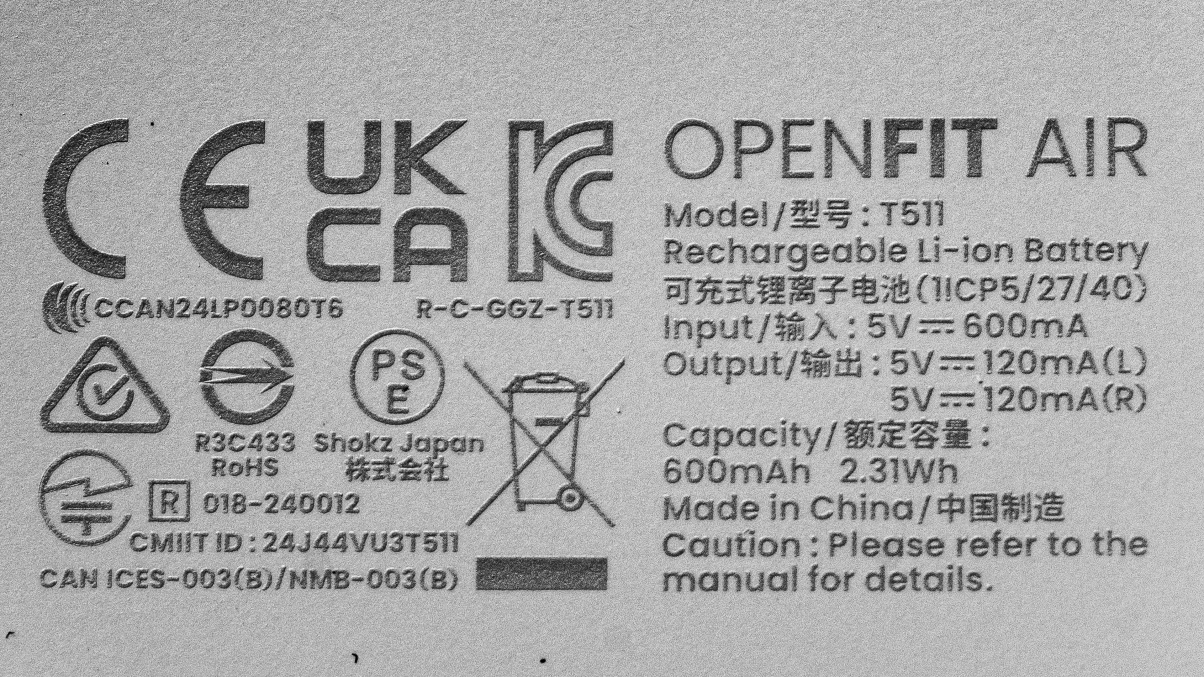 The Shokz OpenFit Air True Wireless come in three colors: 'Black,' 'White,' and 'Pink.' This is our model's label.