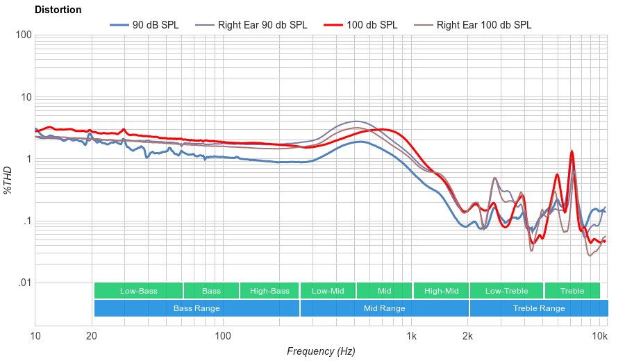 These headphones have an excellent mid accuracy. The range is fairly well-balanced, so vocals and lead instruments are clear. A slight dip in the mid-mid can nudge these sounds to the back of your mix, while a bump in the high-mid can make their upper harmonics sound a bit harsh.