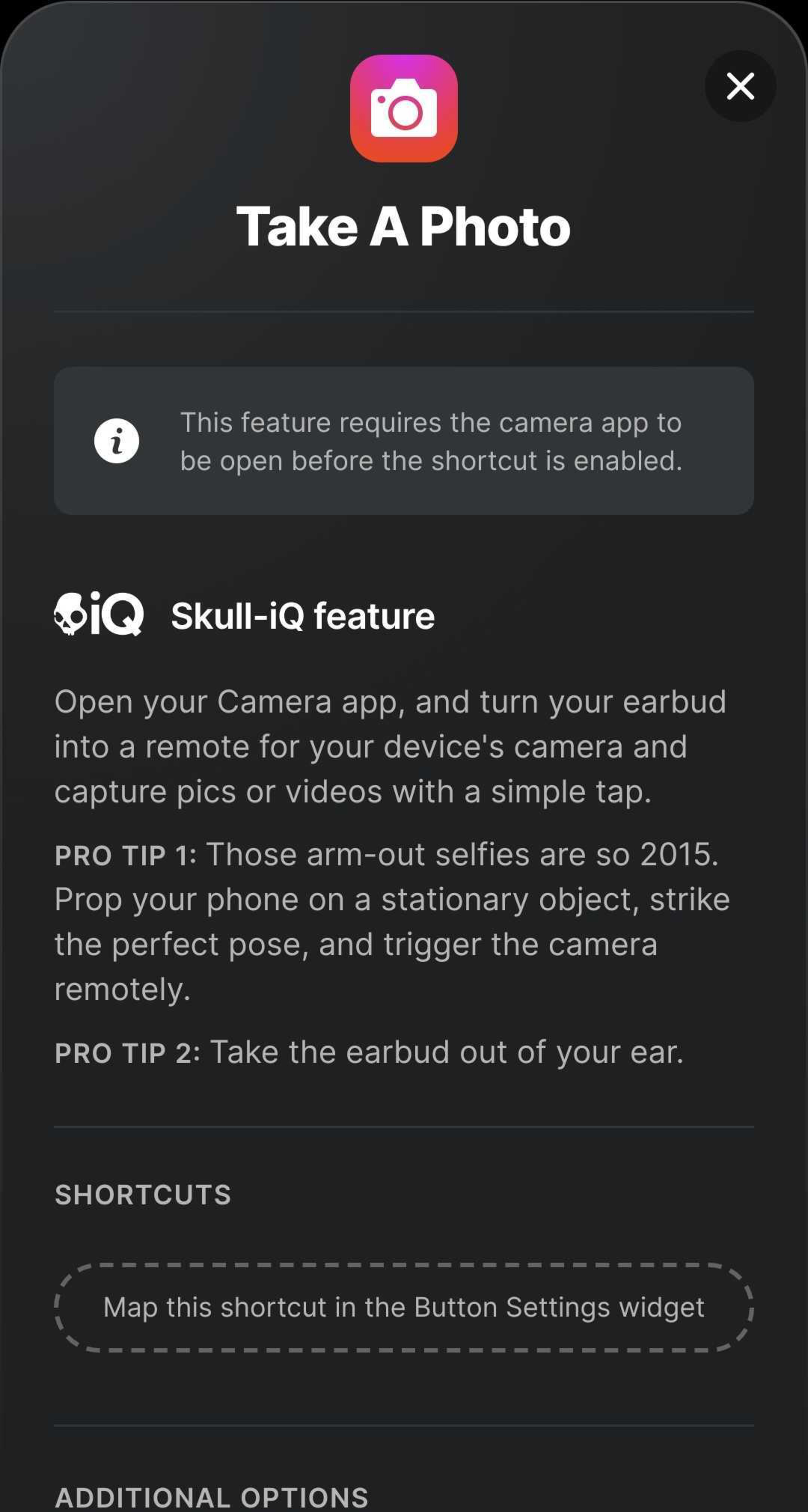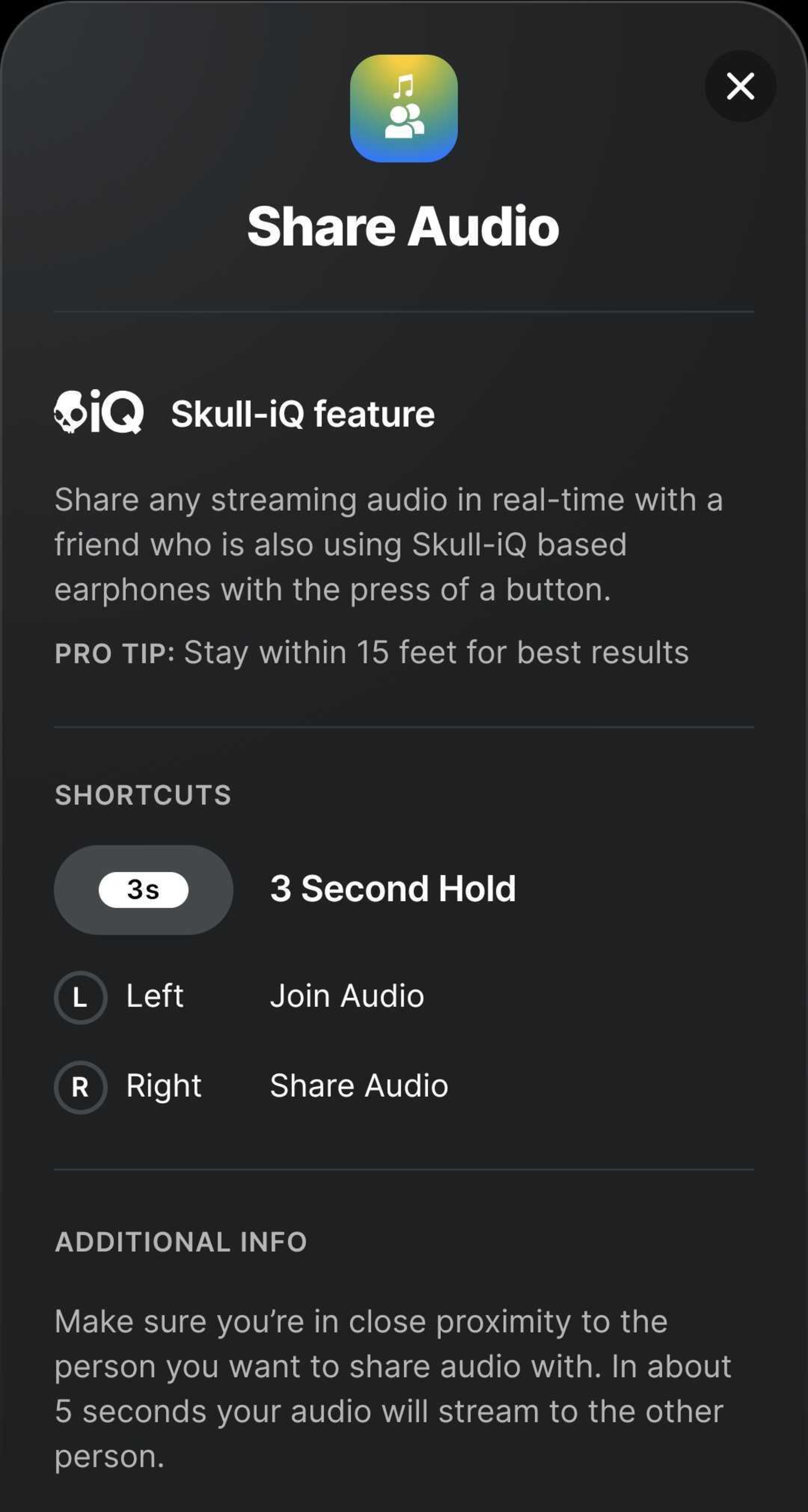 - Press and hold three seconds: Share Audio with another pair of Skull-iQ headphones.
