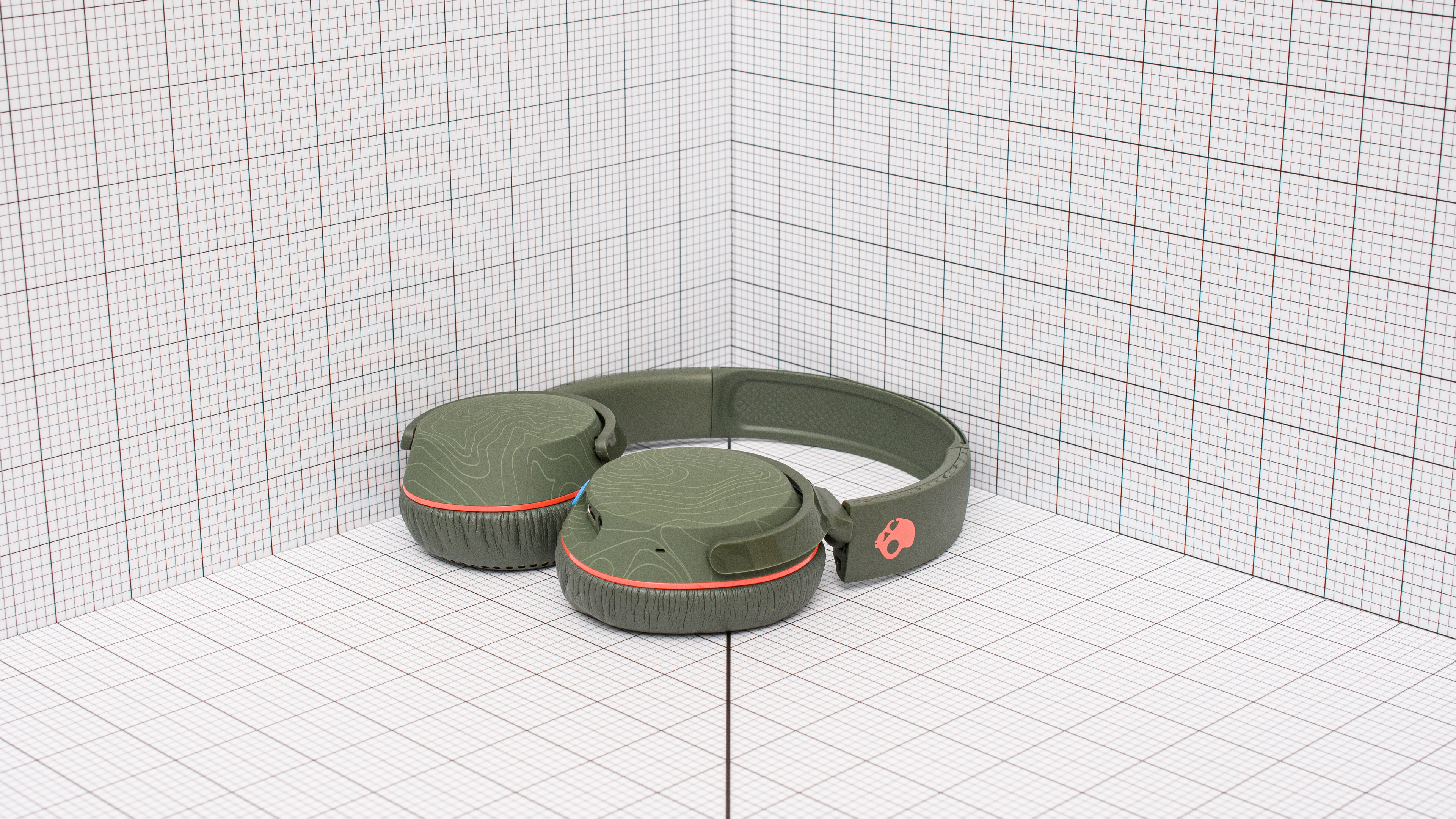 These on-ears have a limited edition skin called 'Forest Green'. Their plasticky frame is mostly olive green with light green topographical detailing on the ear cups. There are also bright orange accents surrounding the ear cups and in the manufacturer's logo on the headband. These headphones only come in one other color variant, 'Black', which is solid in color and doesn't have a pattern on the ear cups.