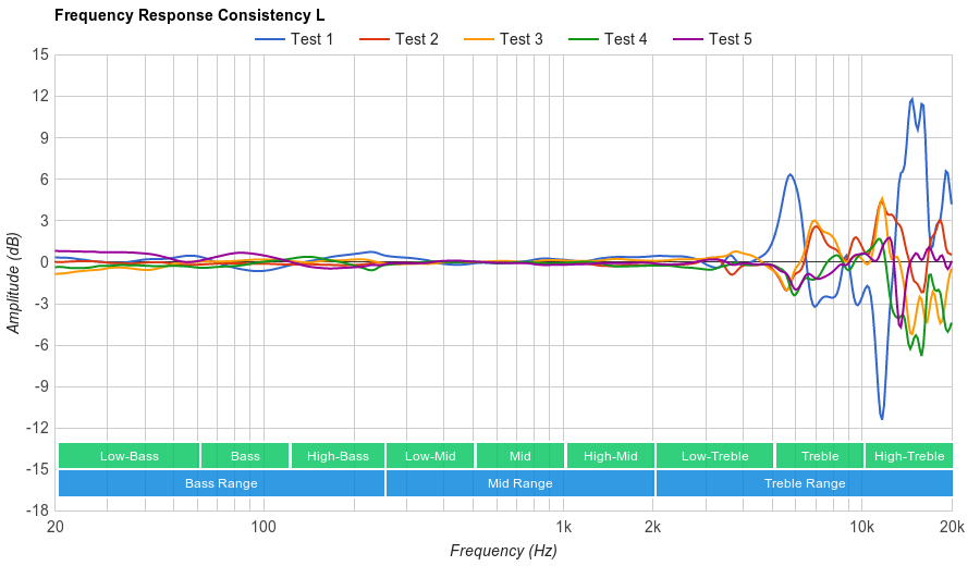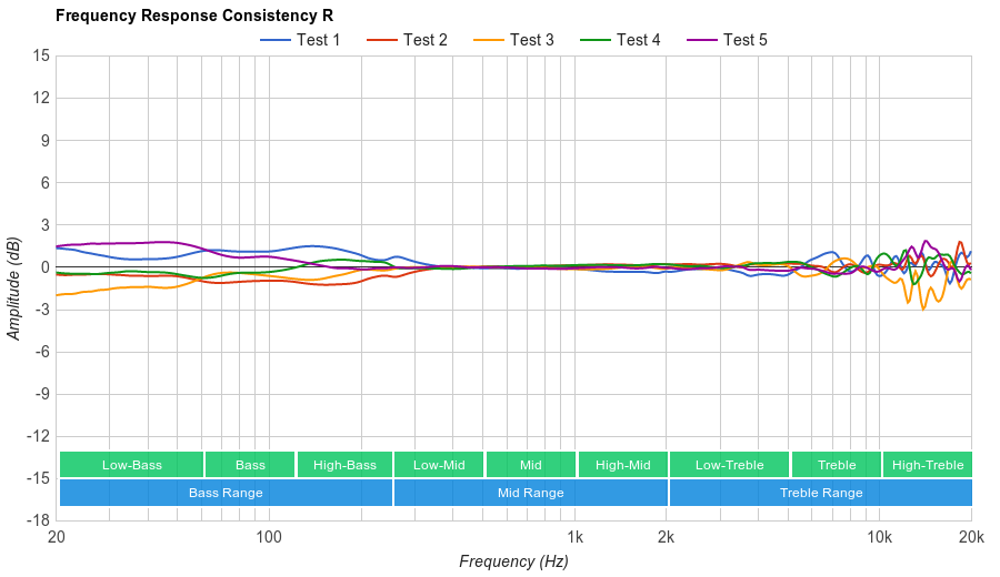 The frequency response consistency of the Sony MDR-1A is good. In the bass range, for some reason the right ear cup shows more inconsistency. But the maximum deviation is about 4dB, which although noticeable is not too bad, especially since it's mostly happening in a narrow region. In the treble range, these headphones show more consistently (below 10KHz), except for narrow deviations between 5KHz and 7KHz.