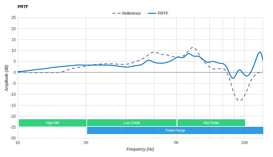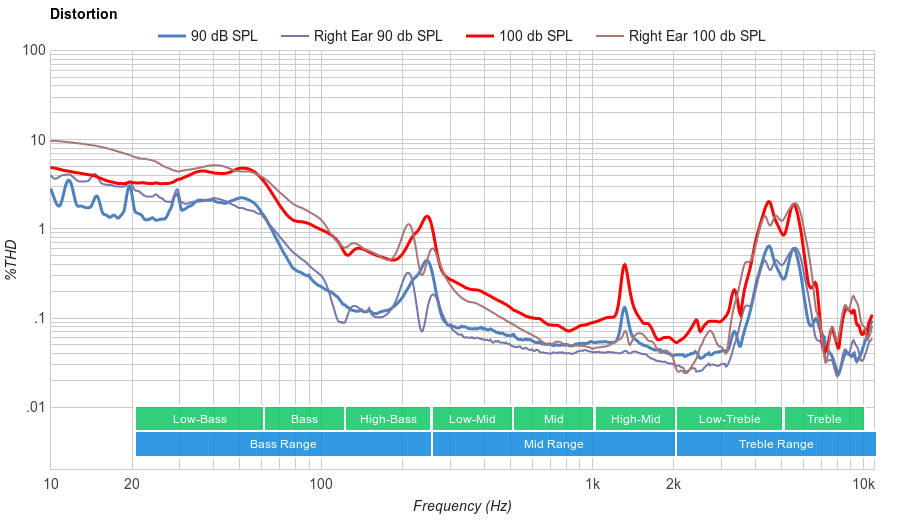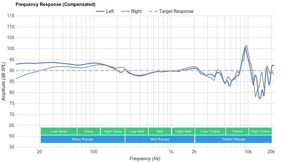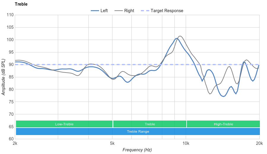 The treble performance is good. Low-treble and mid-treble are slightly underemphasized, and the dip around 5KHz negatively affects the detail and presence in vocals/leads. But the effect will be subtle. The peak in the sibilance range at 9KHz however, means these headphones could sound noticeably sharp and piercing on S and T sounds, especially on overly bright tracks.