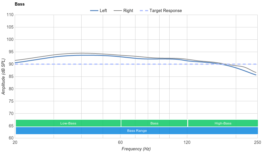 They have good bass accuracy. The range is underemphasized relative to our target curve, but the headphones have enough bass that you won't be missing too much warmth from kick drums. That said, the frequency response rolloff in the low bass means you'll miss out on rumble, which makes these headphones less-than-optimal for enjoying bassy drops in your favorite EDM tracks.
