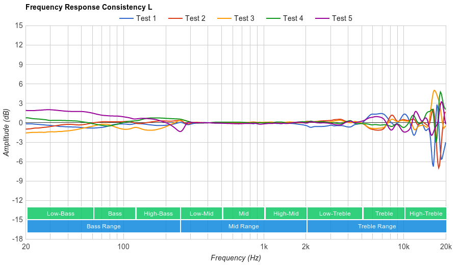 The Sony MDR-7506 have great frequency response consistency. Your listening experience will likely resemble our frequency response measurements, though you may experience slight differences in bass range delivery depending on your characteristics.