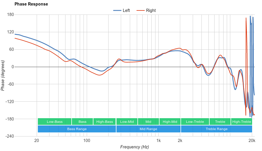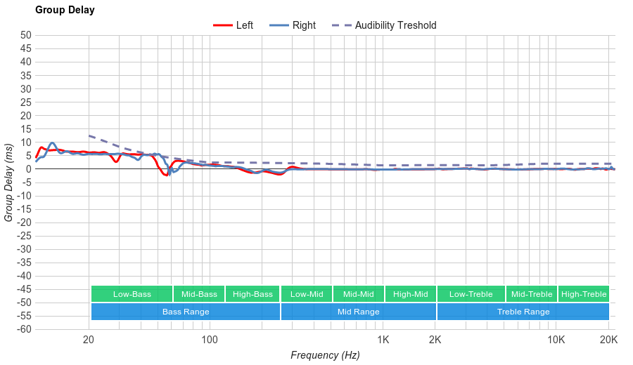 The headphones reproduce tight bass and transparent treble. While the graph shows fluctuations in group delay in the bass range, there aren't audible issues in practice, as they're caused by noise floor interactions with our test setup.