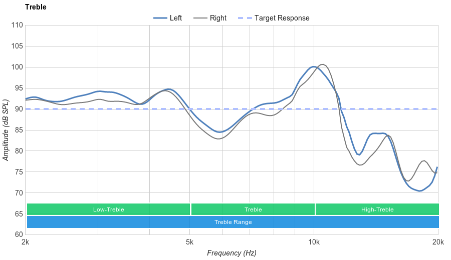 These headphones have amazing mid-range compliance. The response is tilted upward, but follows our target curve well. Depending on your preferences, you may find instruments like snare drums are slightly thin. In songs like Carole King's You've Got a Friend, the vocals sound both present and intimate, and you can clearly distinguish them against the crisp piano accompaniment.