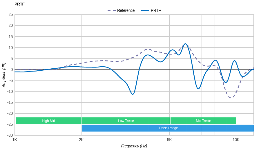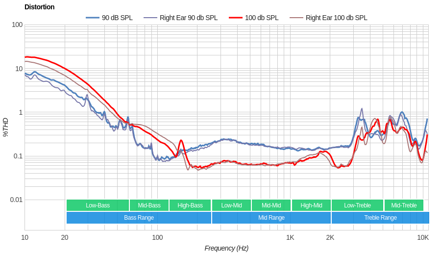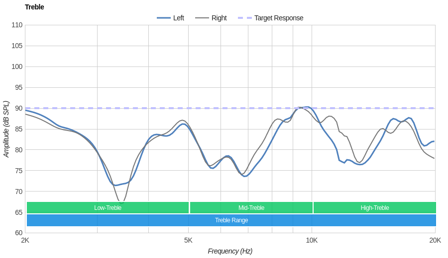 The treble performance is poor. The response is uneven and dramatically underemphasized. Low-treble, mid-treble, and high-treble are under our target by about 8dB, making the sound very dark and lacking in detail, especially considering the amount of bass they produce. On the upside, they seem to be well-balanced in the sibilance range (6KHz-10KHz), which is important for producing cymbals and S/T sounds in vocals.