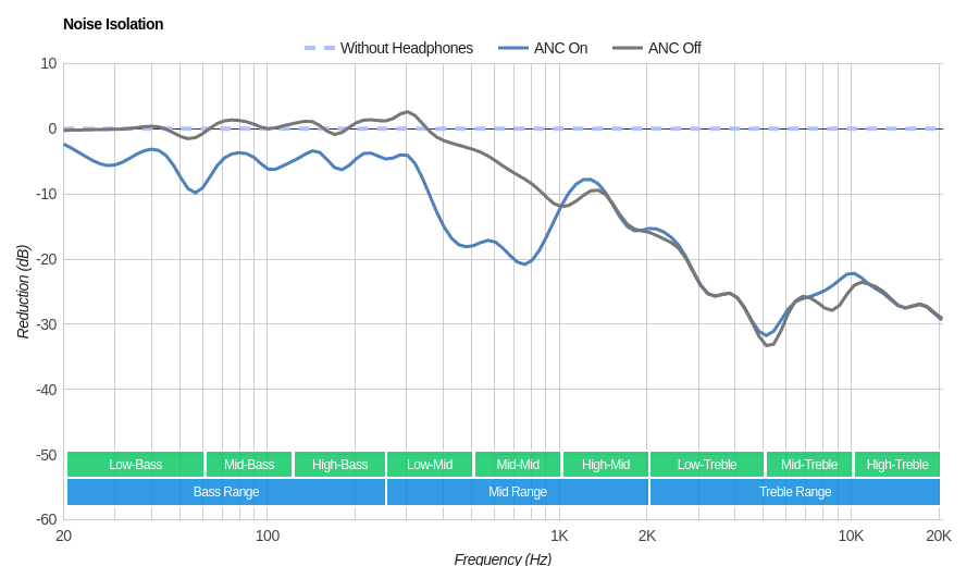 The isolation performance is sub-par. Compared to the Sony MDR-XB950B1, these headphones have active noise cancellation, but they produce a lot of self-noise, which is quite distracting when no music is being played. In the bass range, occupied by the rumble of airplane and bus engines, they achieved about 5dB of isolation, which is sub-par. In mid-range, important for cancelling out speech, they achieved more than 13dB of isolation, which is above average. In the treble range, where sharp sounds like S and Ts sit, they reduce noise by about 25dB, which is above average. The difference between the treble isolation could be due to poor seal on our dummy head, which headphones with small and shallow ear cups are more prone to.