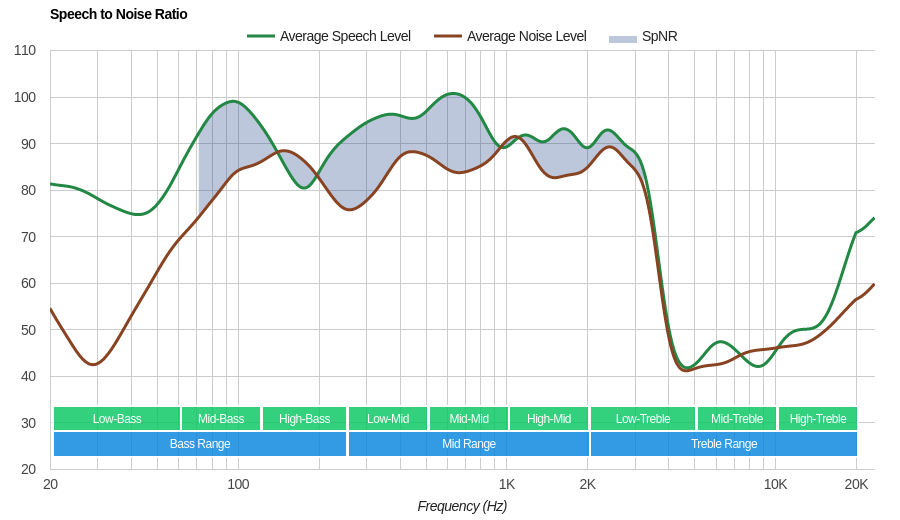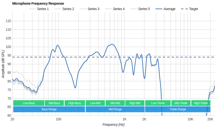 The leakage performance is good. A significant portion of the leakage is between 1.5KHz and 6KHz, a relatively narrow range. This means the leakage will mostly consist of vocals, lead instruments, and cymbals. The overall level of the leakage is not very loud either. With the music at 100dB SPL, the leakage peaks at around 55dB SPL, which is about the same as the noise floor of most offices.