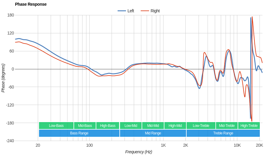 The imaging performance is great. Weighted group delay is at 0.24, which is quite good. The GD graph also shows that the group delay never crosses the audibility threshold, which is impressive considering how much bass these headphones produce. The result is a tight bass and a transparent treble reproduction. Additionally, the L/R drivers of our test unit were very well-matched, ensuring accurate placement and localization of objects (voice, instruments, video game effects) in the stereo image.