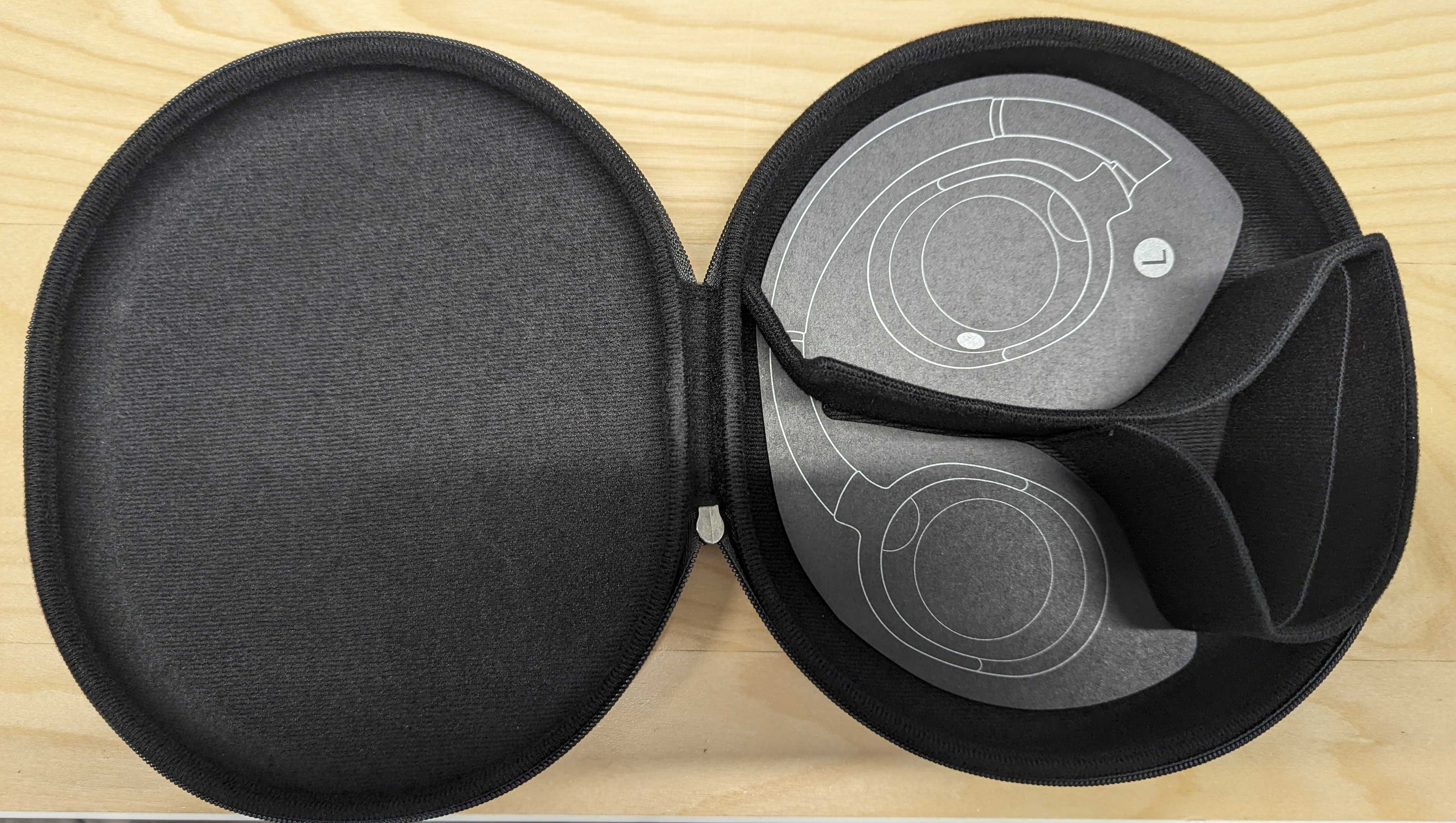 They come with a great circular carrying case that's made of a soft tweed-like material that's reinforced to better protect the headphones. There are two compartments to store cables and other accessories. You can see a picture of the interior here.
