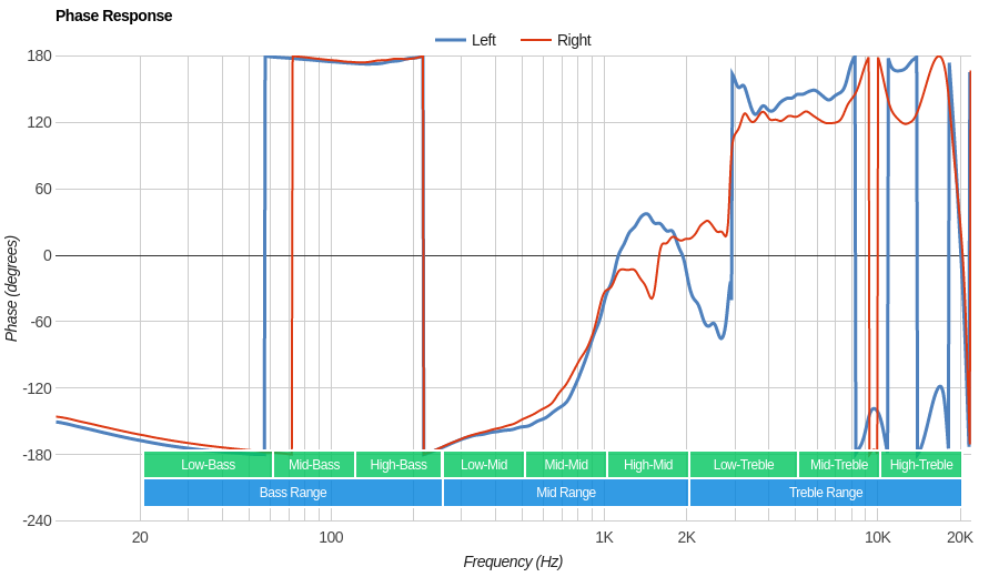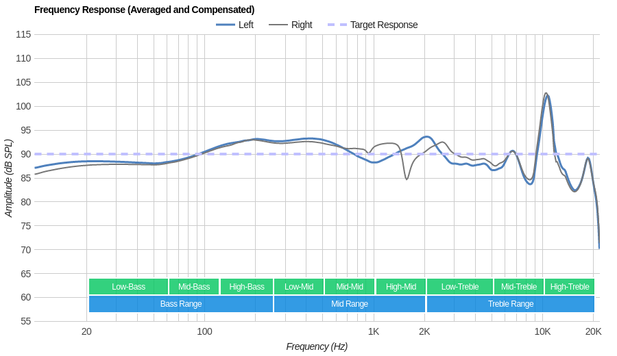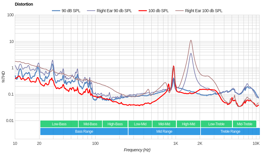 These in-ears have excellent bass. Their LFE (low-frequency extension) is at 10Hz, which is excellent. But low-bass is underemphasized by about 2dB. This means they can produce low thumps and rumbles, but at a slightly lower level than our reference. Mid-bass, which is important for the punch of bass and kick instruments, is virtually flat and flawless. High-bass, however, shows a 3dB bump which could add a bit of boominess to the sound. Overall, the bass of the Sony is deep and well-extended, but a bit light on sub-bass and a bit boomy sounding.