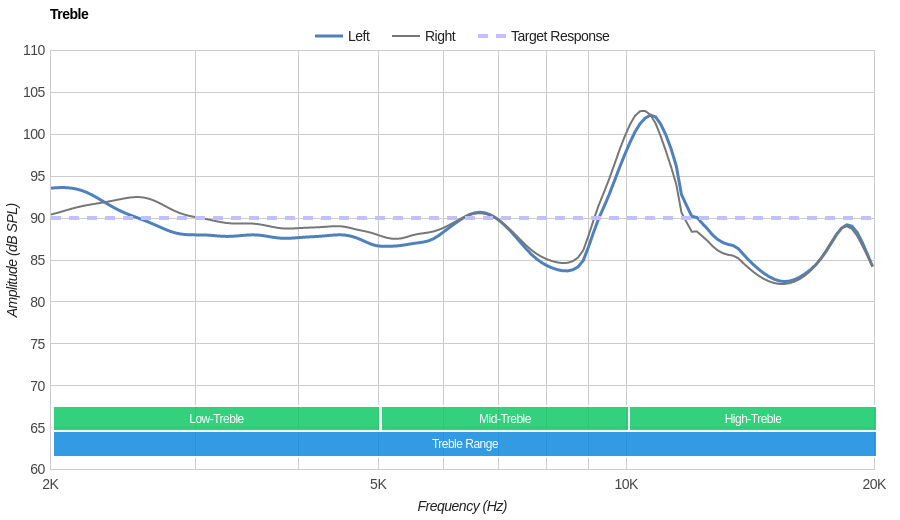 The Sony WF-1000X have a very good treble. Low-treble is flat and within 0.5dB of our target, which is excellent. However, there is a 12dB bump around 10KHz, which makes the sound of these headphones noticeably sibilant. Overall, their treble is well-balanced and detailed but could sound sharp and piercing on S and T sounds.