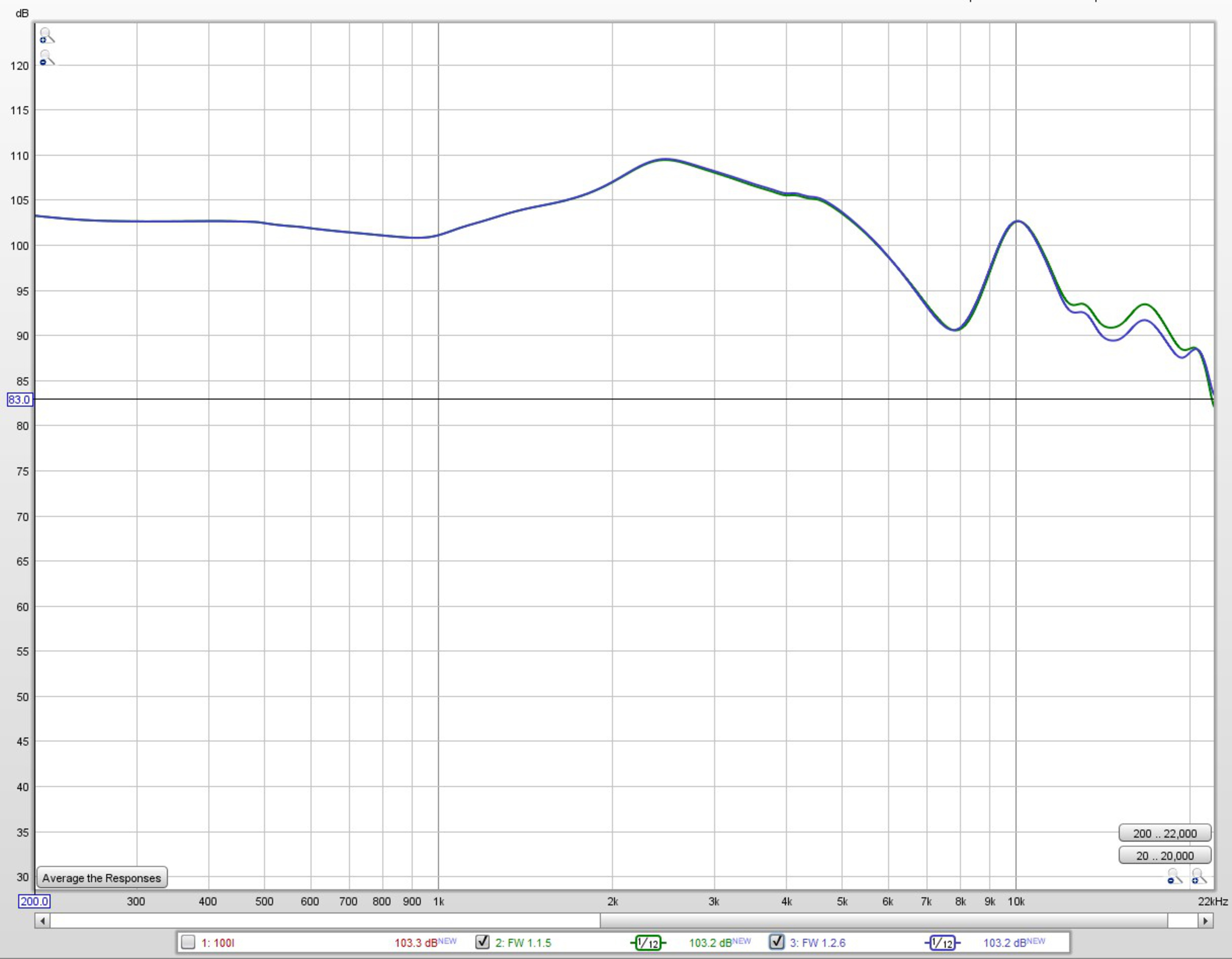 These results are based on the headphones' performance with firmware version 1.1.5. You can see a comparison of their frequency response using version 1.1.5 versus 1.2.6 here. You can also see a comparison of their frequency response using firmware version 1.2.6 versus 1.3.3 for the left and right drivers separately. The original results are in red, while a blue line for the left driver and a green line for the right driver represents the new 1.3.3 results. However, the firmware updates didn't significantly change the headphones' sound performance.