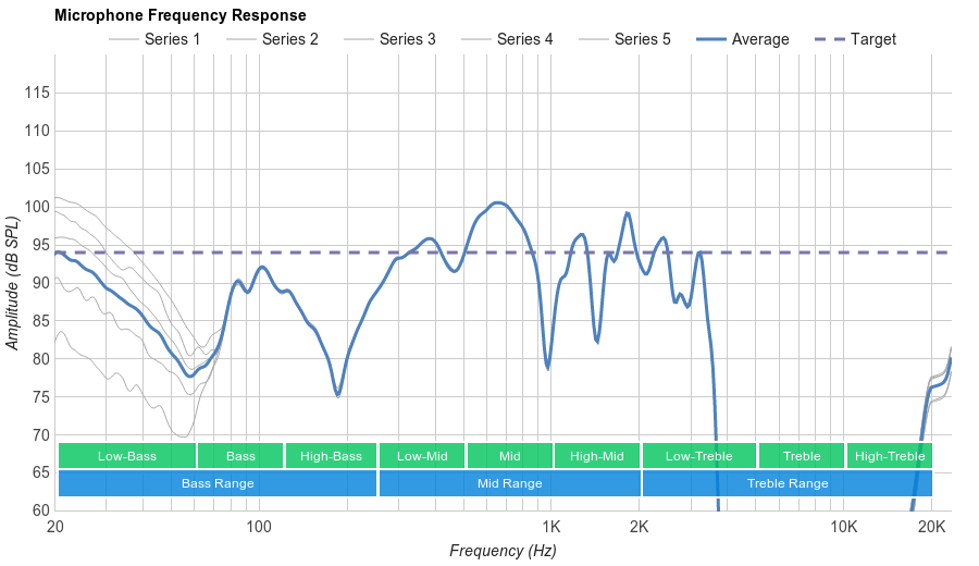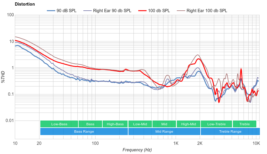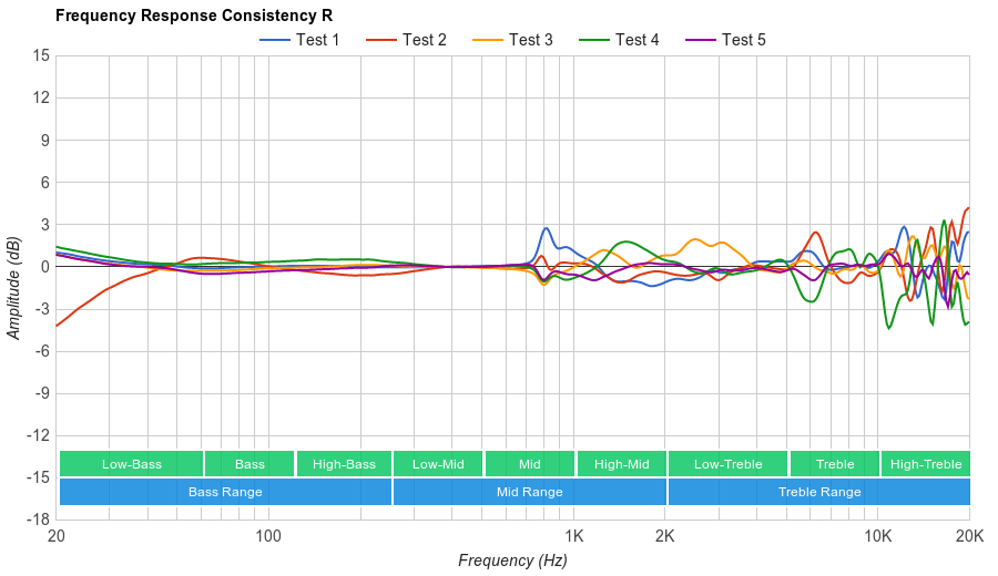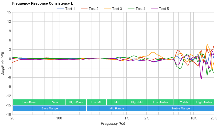 The frequency response consistency of the Sonys are very good. Similar to the MDR-1000X and QuietComfort 35, the Sony WH1000XM2 seem to be using its noise cancelling system to check for bass consistency. Therefore, in the bass range they perform extremely consistently across our five human subjects. In the treble range, they are decently consistent, but not as much as the bass range, showing about 6dB of deviation between 2KHz and 10KHz. This results in a consistent delivery of bass and treble across multiple users and re-seats.
