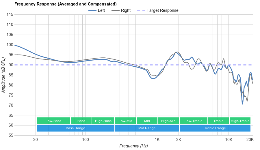 The bass of the Sony WH-1000XM2 is very good. Their LFE (low-frequency extension) is at 10Hz, which means they are able to produce low thumps and rumbles. Also, the entire response is virtually flat across the bass range, but consistently over our target by more than 2dB, especially in high-bass. This results in an extended and punchy bass, but with the downside of sounding a bit boomy and cluttered.