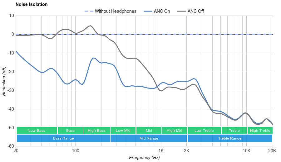The active noise cancelling (ANC) system of the Sony WH-1000XM2 is excellent. They perform nearly identical to the 1000X, within our margin of error. They achieve about 19dB of isolation in the bass range, which is important for cancelling out the rumble of airplane and bus engines. In the mid-range, where the bulk of speech sits, their reduction is more than 26dB. In the treble range, important for cutting out sharp S and T sounds, the Sonys achieve a isolation of 40dB, which is great.
