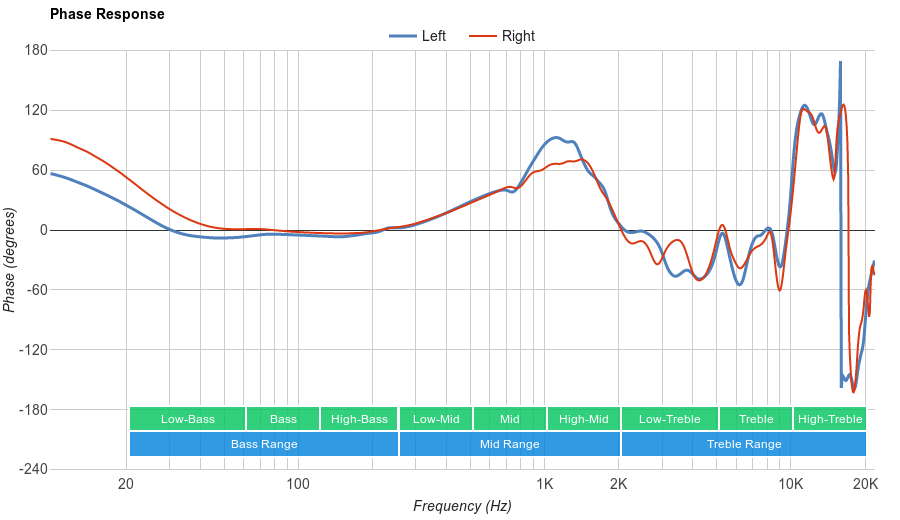 The Sony WH-1000XM2 have great imaging. Their weighted group delay is 0.15, which is very good. The graph also shows that the entire group delay is below our audibility threshold, which was not the case with the MDR-1000X. Our L/R drivers of our test unit was also very good in terms of frequency, amplitude, and phase matching. This is important for proper and accurate localization of objects (such as voice, footsteps, and instruments) in the stereo field.
