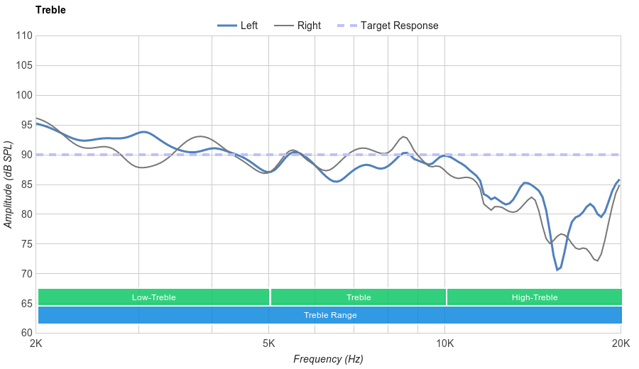 The Sony WH-1000XM2 have a very good treble range performance. Low-treble and mid-treble are flat and within 2dB of our target response. This ensures a balanced reproduction of vocals and leads. In high-treble, these headphones have fixed the steep roll-off issue that the MDR-1000X had and although this will give more "air" to the treble of XM2, the effect will be quite subtle.