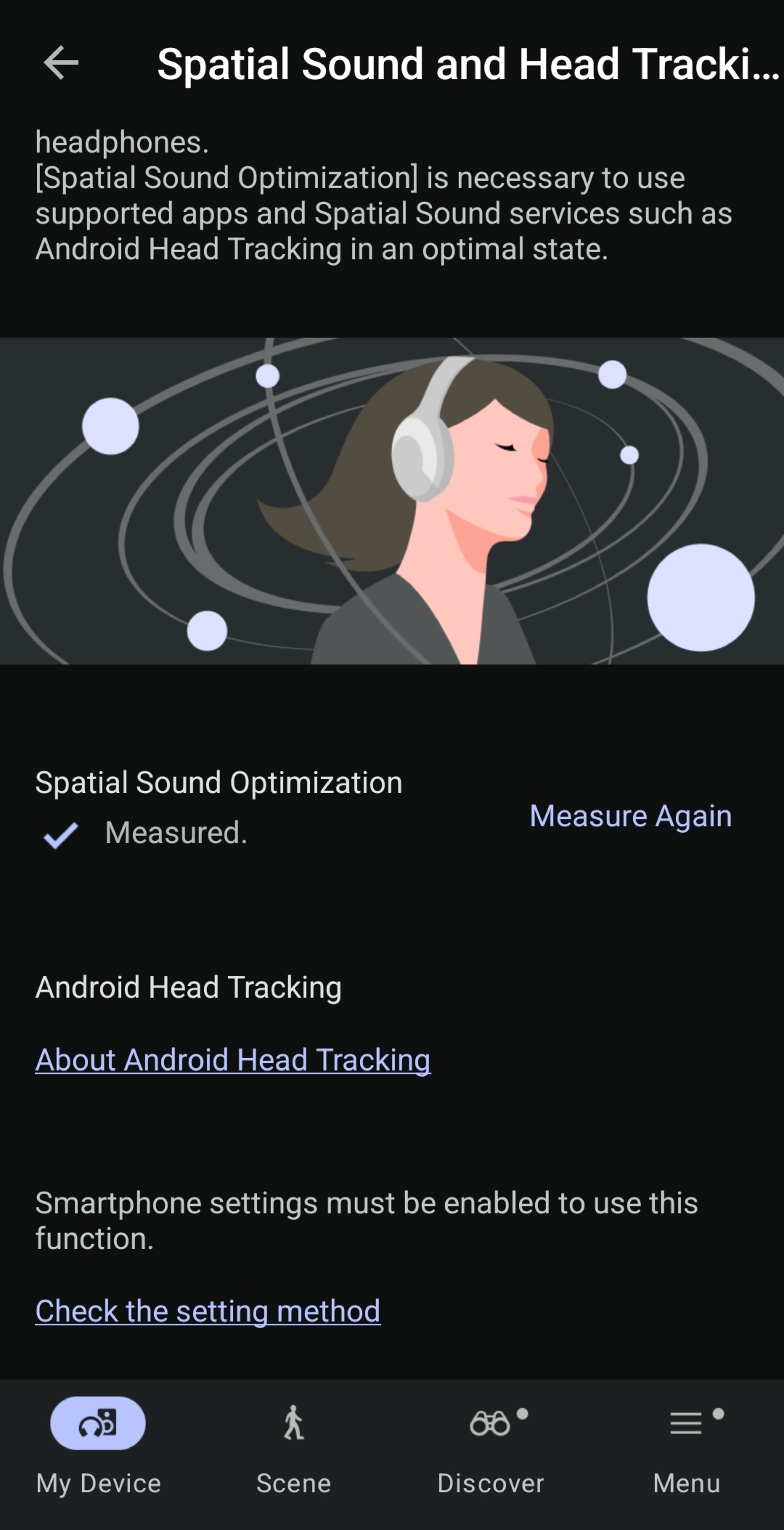 The 360 Reality Audio feature can provide a superior sound quality by creating an immersive, 360-degree audio experience. It uses the Analyze Ear Shape feature in the companion app to help optimize audio for your unique ear shape. However, you must subscribe to a paid service, like Amazon Music Unlimited, to benefit from the virtual soundstage feature. Sony added some head-tracking capabilities to these headphones with firmware update 2.0.2, accessed via the Spatial Sound and then, Head Tracking menu. You'll need a device running Android 13 or later, which utilizes the Android Head Tracking feature. Head-tracking is only compatible with certain apps. It doesn't include the additional head-tracking listening modes available on the Sony WH-1000XM6.