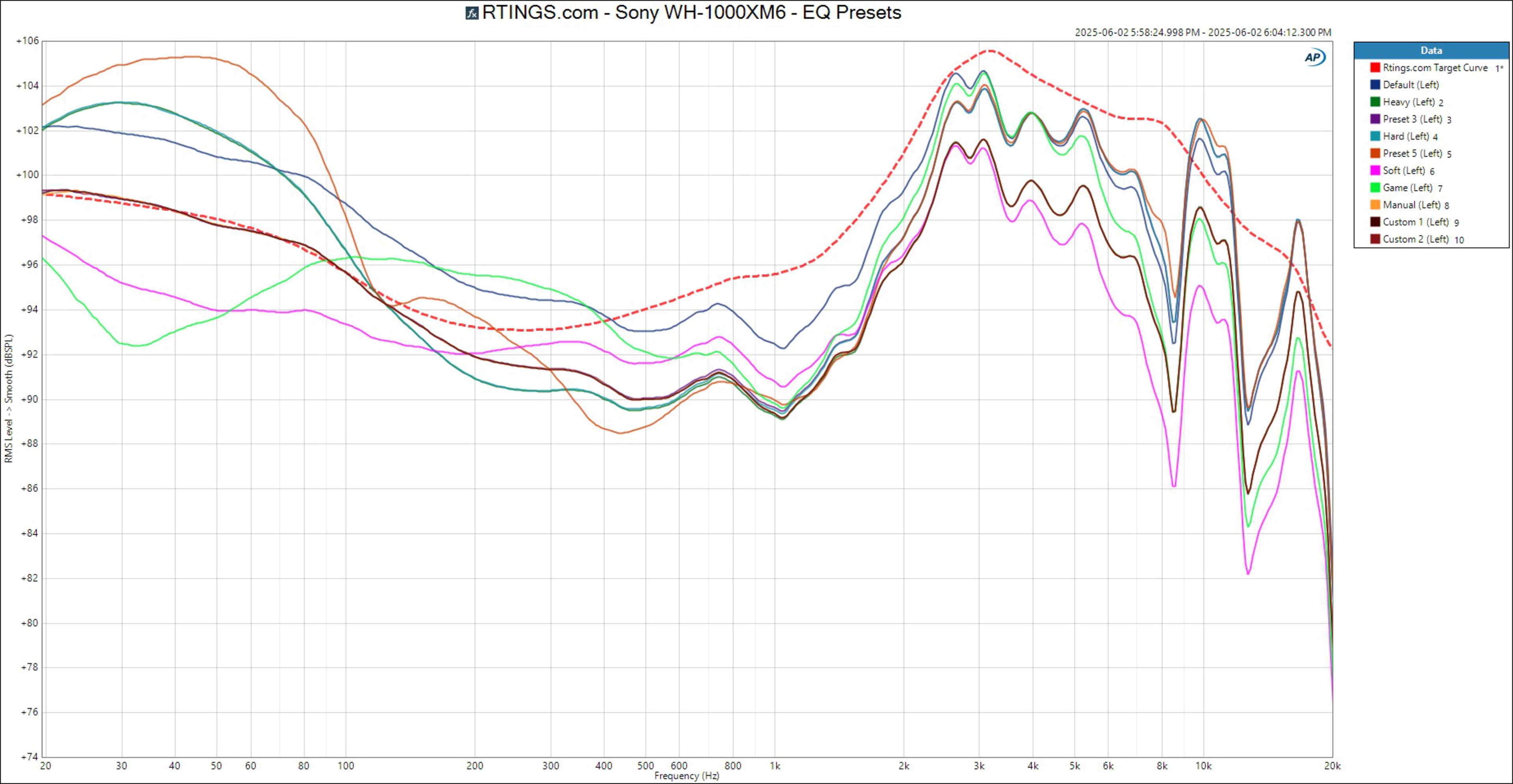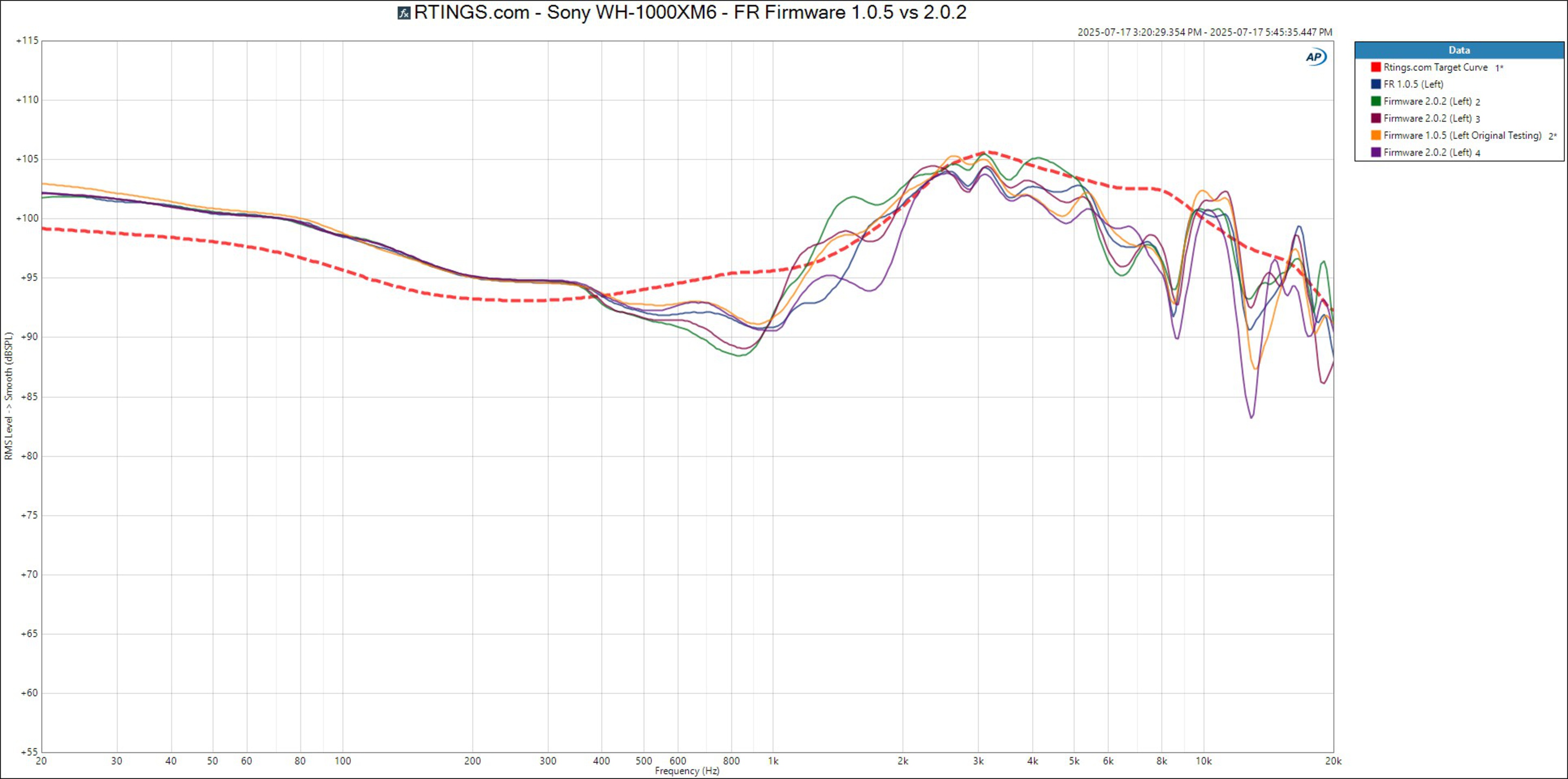 After observing user requests to measure the frequency response after firmware update 2.0.2, we re-tested these headphones with their firmware updated. However, we didn't notice any changes in the frequency response that couldn't be attributed to variations caused by reseating the headphones.