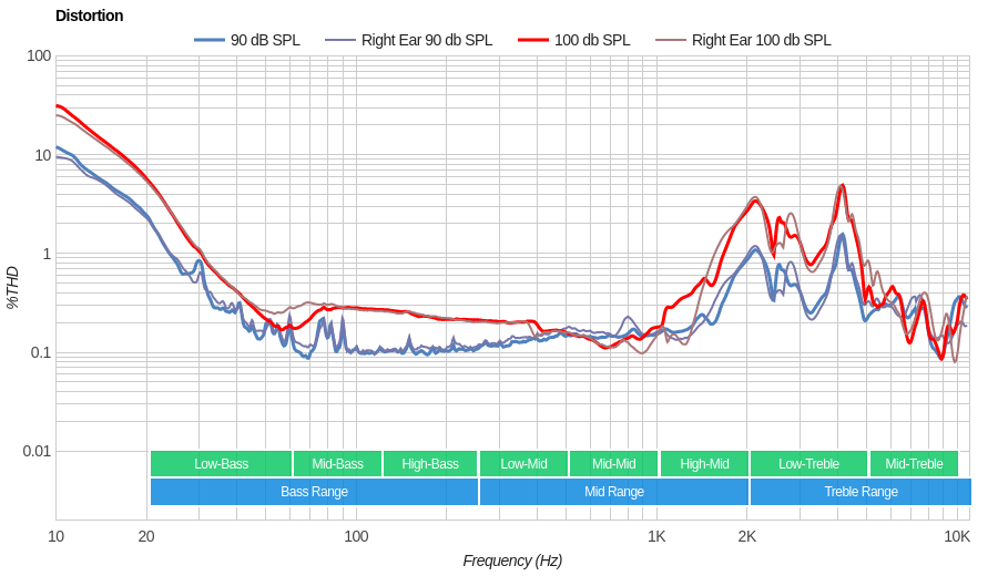 The mid-range performance of the WH-H900N is excellent. The response throughout the range is even, flat, and within 1.5dB of our neutral target. This results in a well-balanced mid-range, and a clear reproduction of vocals and lead instruments.