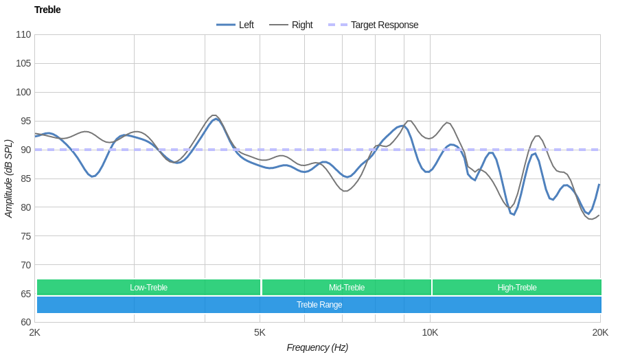The treble range performance of the Sony WHH900N is great. The response is rather uneven, but well-balanced throughout the range. Low-treble and mid-treble are within 1.5dB of our neutral target. This suggests a well-balanced reproduction of vocals, lead instruments, and cymbals.