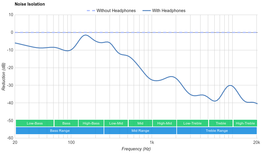 Decent isolation. Being non-noise cancelling headphones the performance is impressive, especially in the mid and bass ranges. They achieve an above average isolation of 35dB in the treble range and 20dB of isolation in the mid range.
