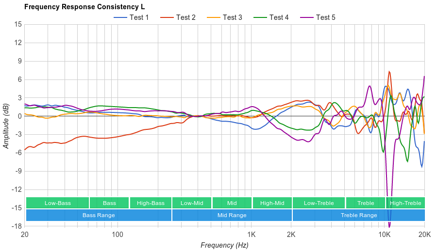 The frequency response consistency of the SteelSeries Arctis 7 Wireless 2017 is disappointing. Bass delivery varies and a drop in bass can occur if the ear cups are not flush to your head. There are inconsistencies from mid-mid into the treble range. However, once you achieve a good fit and seal, you'll get the same sound each time you use these headphones.