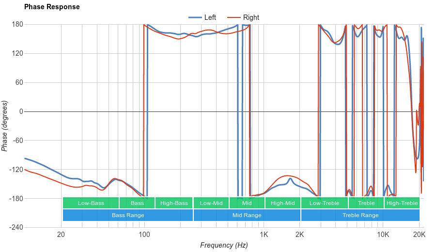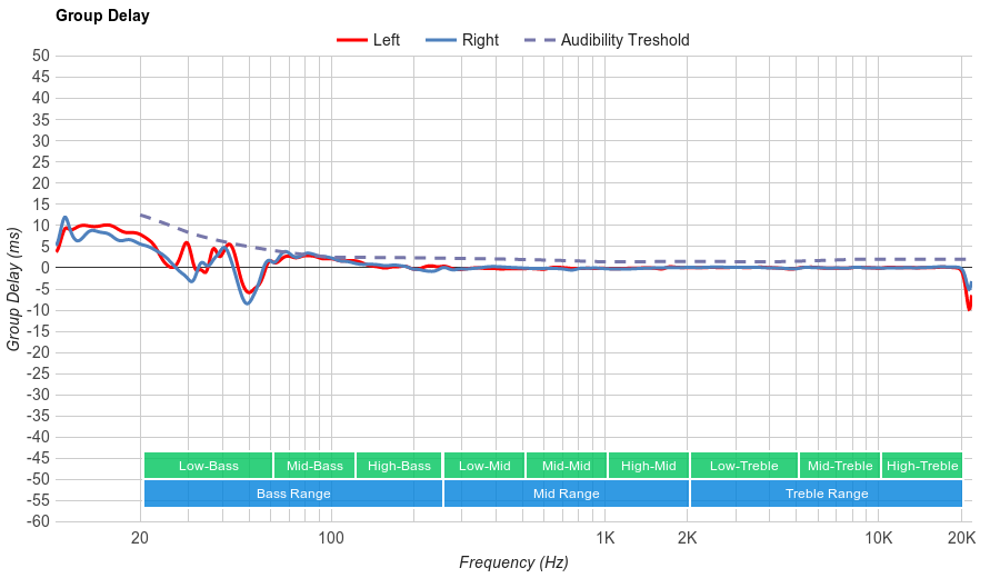 The SteelSeries Arctis 7 have great imaging. The group delay response is fairly low and it falls below the audibility threshold, which should result in a tight bass and a transparent treble production. The L/R drivers of our unit are fairly well-matched in amplitude, frequency, and phase response, ensuring accurate placement and localization of objects such as voice, instruments, and footsteps in the stereo image. However, these results are only valid for our unit, and yours may perform differently.