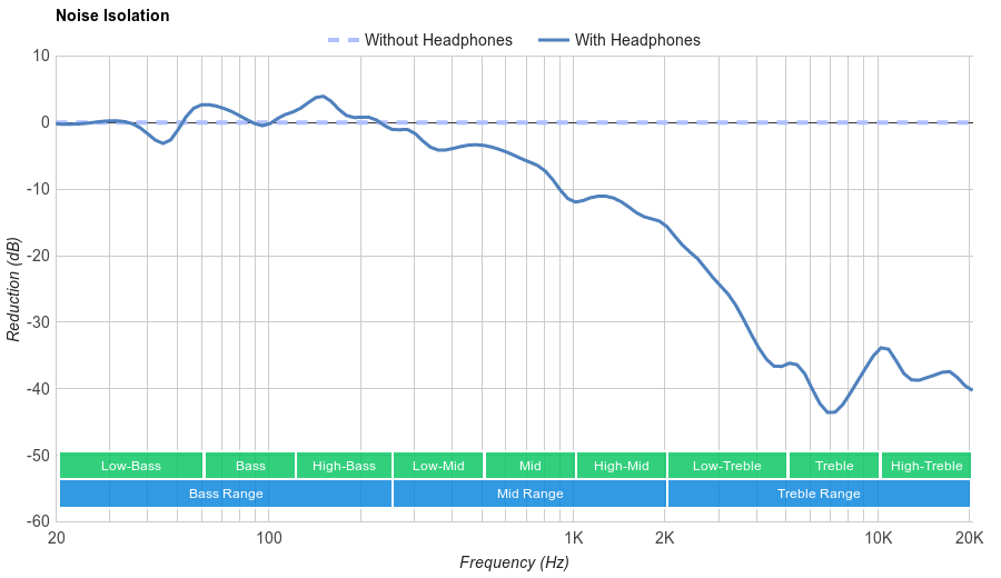 The noise isolation performance is poor. They let in all bass range sounds like bus and plane engines. While they do a better job of reducing mid-range noise such as chatter, they still let in a lot of sound and may not be suited for an office setting. However, these headphones can significantly reduce sibilants such as S and T sounds in the treble range.