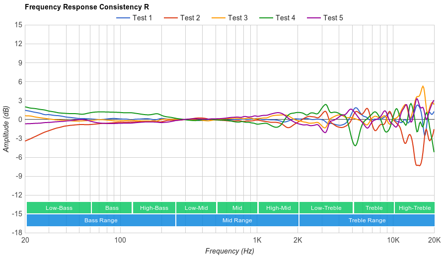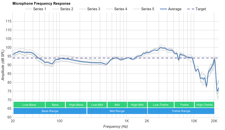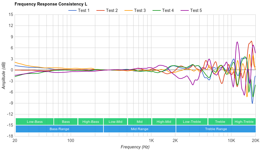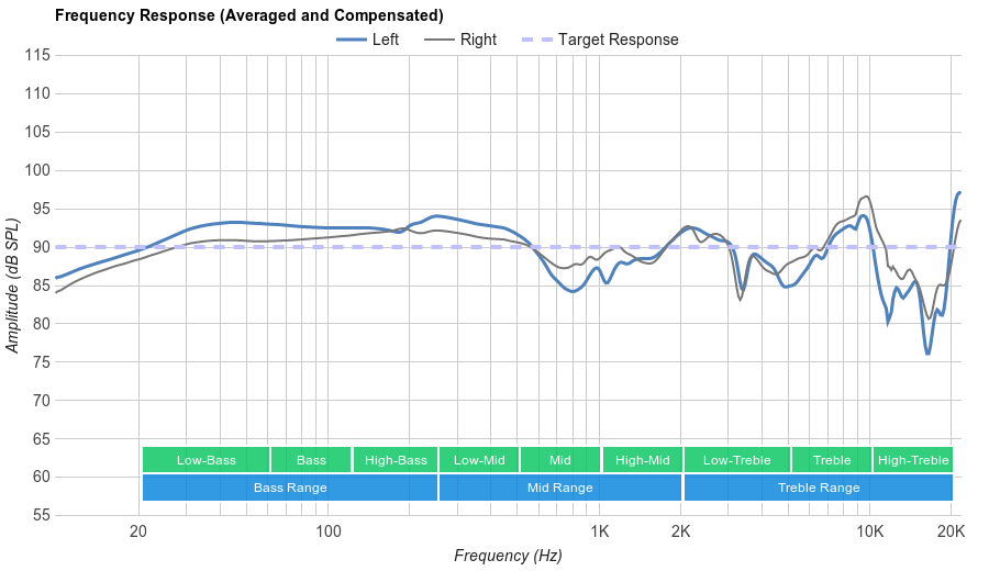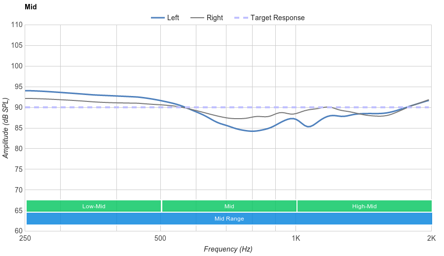Very good mid-range performance. The overall mid-range response is rather inconsistent but within 2dB of our target. The 2.3dB overemphasis in low-mid adds a bit of clutter and mud to the mix, and the 2dB dip around 8KHz pushes the vocals/leads slightly to the back of the mix.