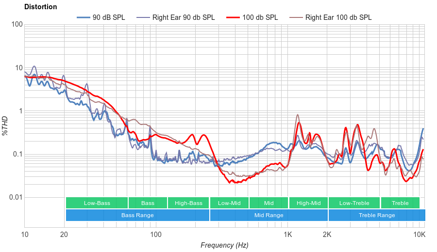 Great bass range performance. LFE is extended down to 12Hz, which is excellent. The overall response of the bass range is virtually flat, but with about 2dB of constant over-emphasis. It makes the overall sound of these headphones slightly bass-heavy.
