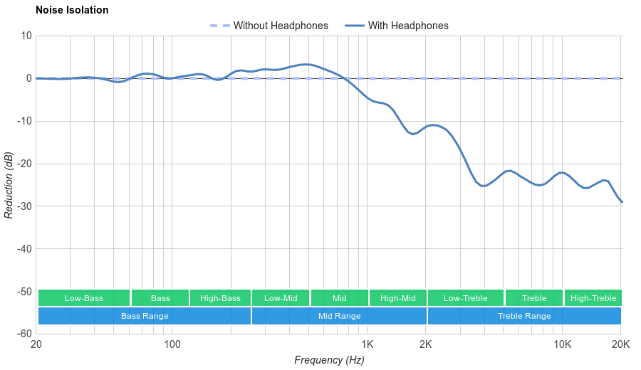 Poor isolation, which is expected of their open-back design. The SteelSeries Siberia 200 doesn't isolate any noise below 900Hz. Above that frequency, they achieve more than 21dB of isolation, which is about average.