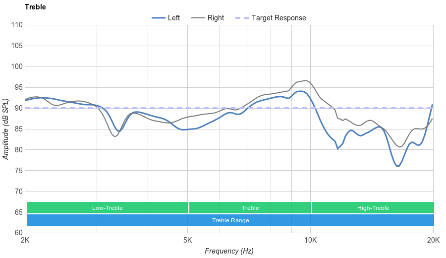 Very good treble range performance. The average treble range response is within 2dB of target up to 10KHz. The remarkable feature here is the small dip around 5KHz, negatively affecting the presence and detail of vocals/leads.