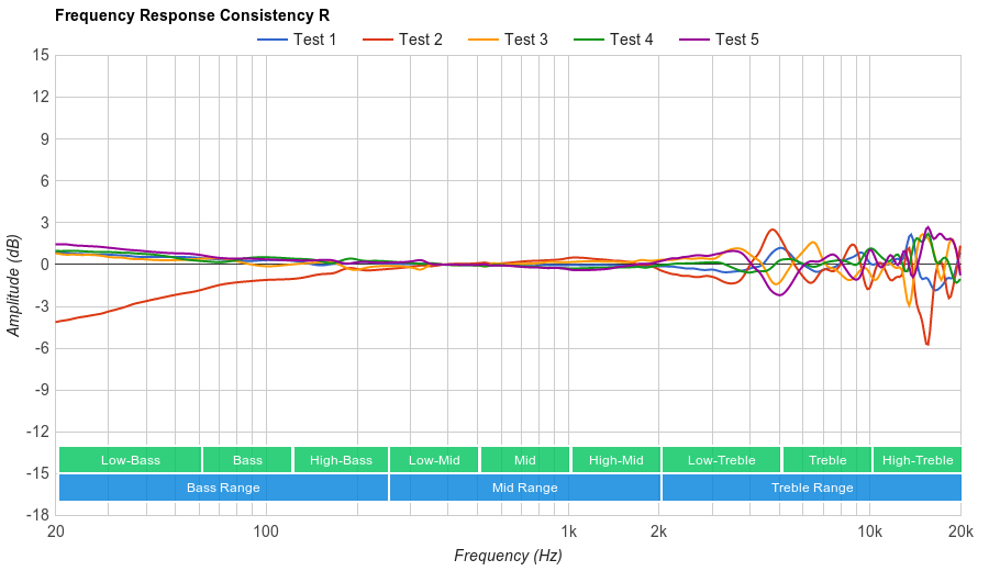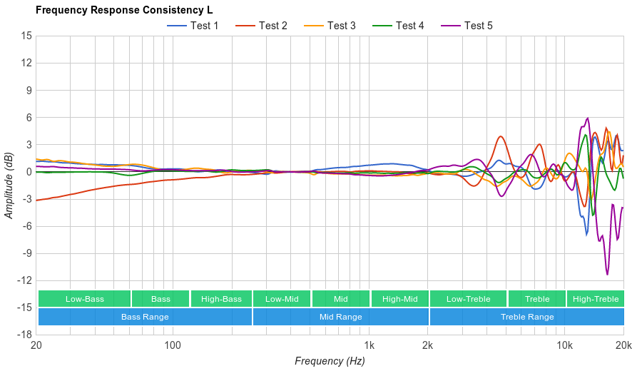 Good consistency. The Bass Range of our Over-Ear and On-Ear headphones are measured on 5 different human subjects, 5 times each. In the graphs, each line represents an individual's average Bass response. The variance in the Bass range is very little, except for one of our test subjects who wears glasses, which gets about 3dB less Bass at 40Hz. In the Treble Range the variance is about +/-3dB is which is decent.
