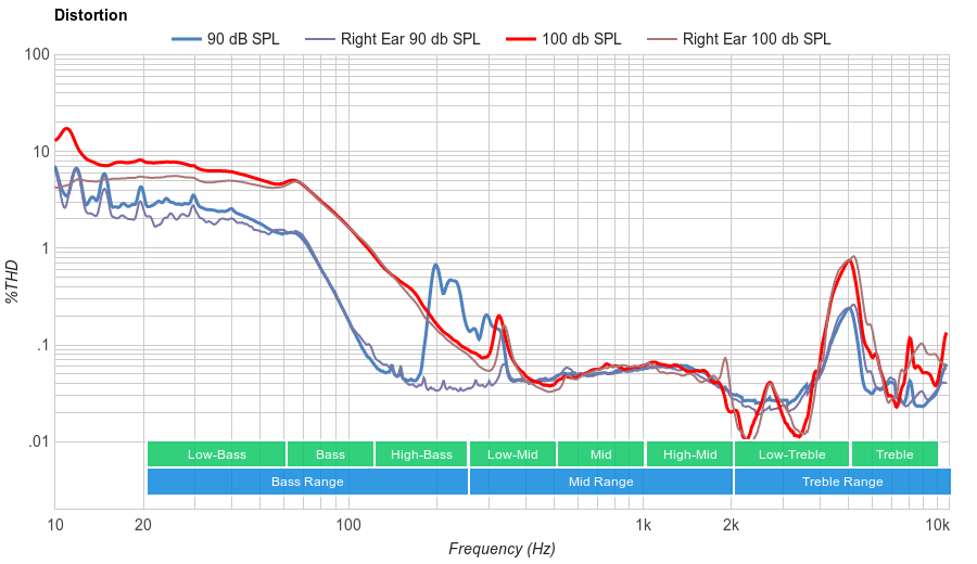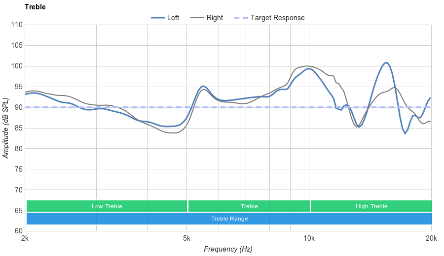 Good Treble Range performance. Low-treble and treble are a bit inconsistent. Additionally, treble and high-treble are overemphasized by a couple of dBs, making these headphones a bit bright and sharp on certain tracks.