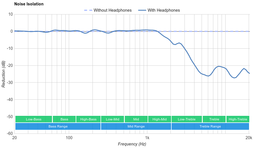 Poor Isolation. Given the semi-open design of these headphones, poor isolation is natural. These headphones don't block any noise below 1KHz. Above that, they achieve about 20dB of reduction which actually is above average.
