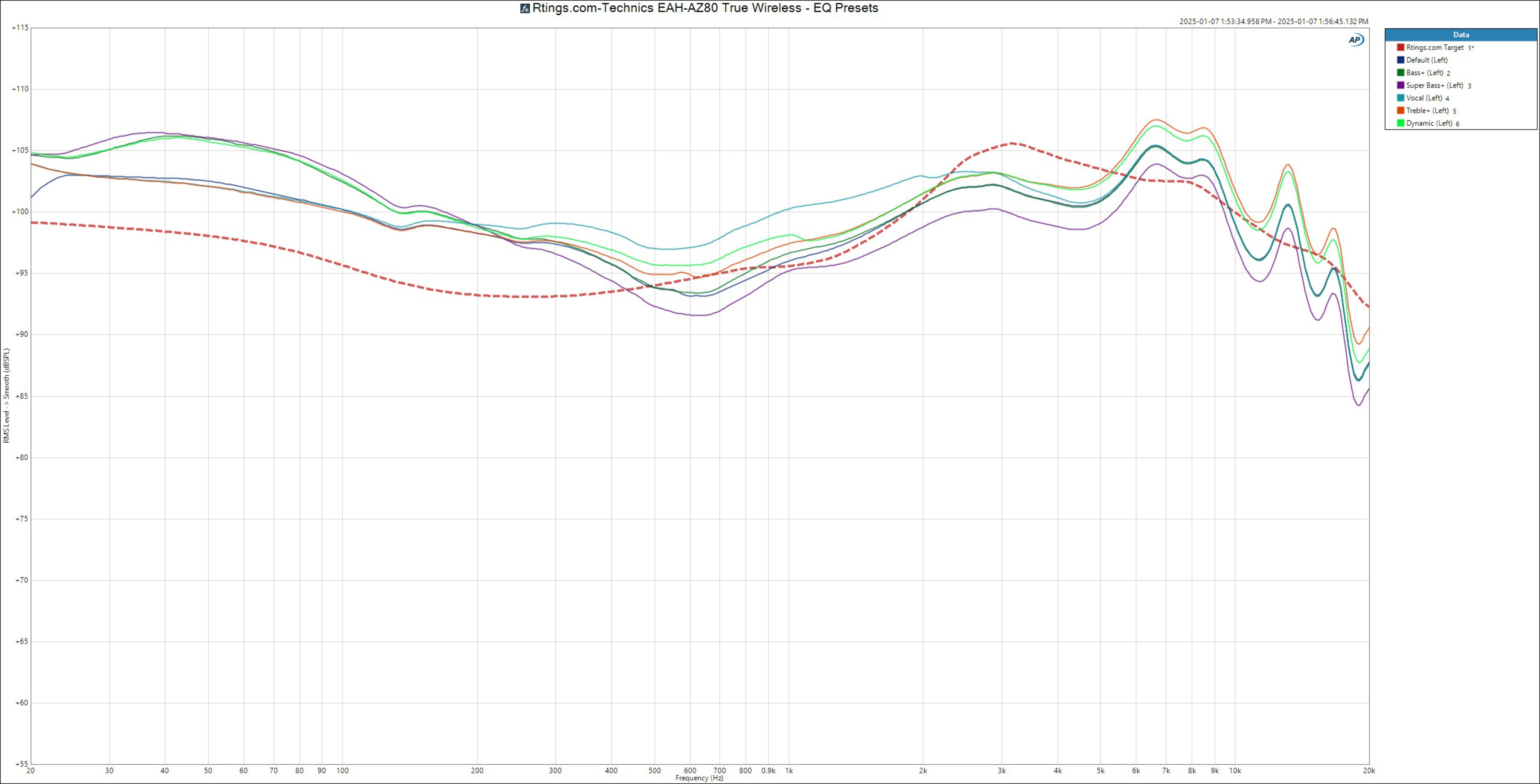 The Technics EAH-AZ80 have a warm default sound profile. In this graph, you can see how the different EQ presets affect the sound profile. As with other ANC-equipped earbuds, like the Sony WF-1000XM5 Truly Wireless, their sound profile is slightly different with the ANC enabled, with a slightly boosted bass response audible when the ANC is off compared to on. The sound is also altered when the mic is engaged, for example, when you're on a call. You can see a graph of how this affects the frequency response in Recording Quality.