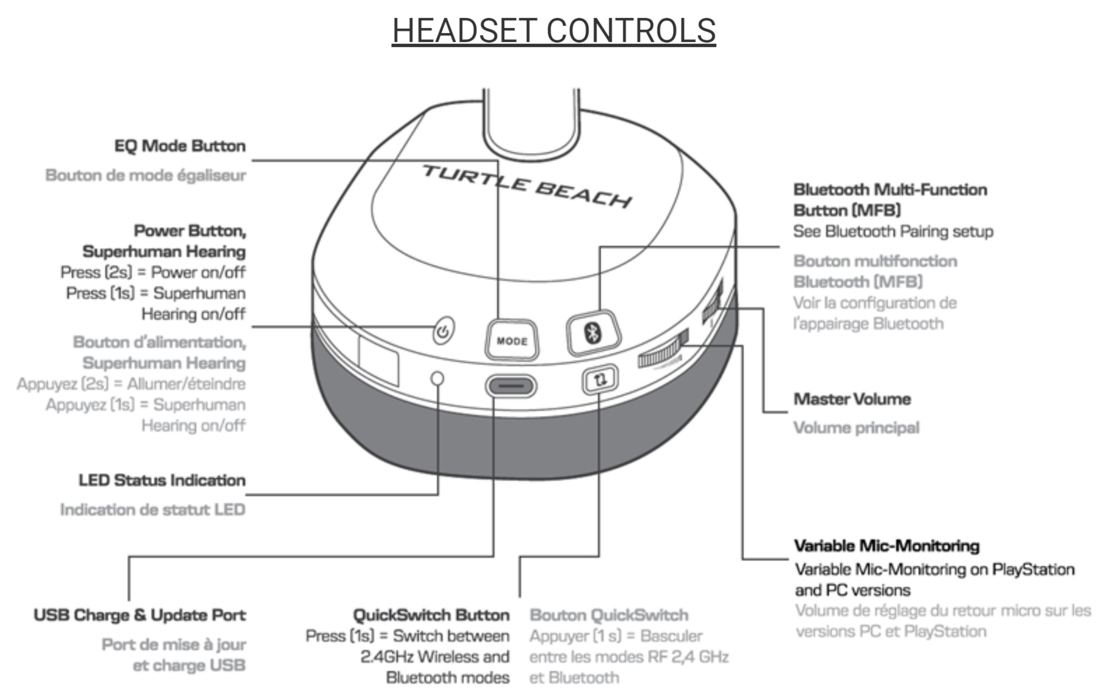 The Turtle Beach Stealth 500 have very good controls. Many functions have their own buttons or dials, like volume, EQ mode, connection mode, and sidetone. The headset also provides you with helpful feedback tones when you change between EQ presets, power on or off, or pair the headset with a new device. Unfortunately, like the Turtle Beach Stealth 600 (Gen 3) Wireless, the plentiful buttons are stiff to press and feel somewhat haphazardly placed, making them a bit difficult to distinguish from one another. The Stealth 500 also have much smaller and harder-to-feel dials than the Stealth 600 (Gen 3). Still, flipping the microphone up to mute is a very useful feature. You can check out a diagram with a full list of controls here.