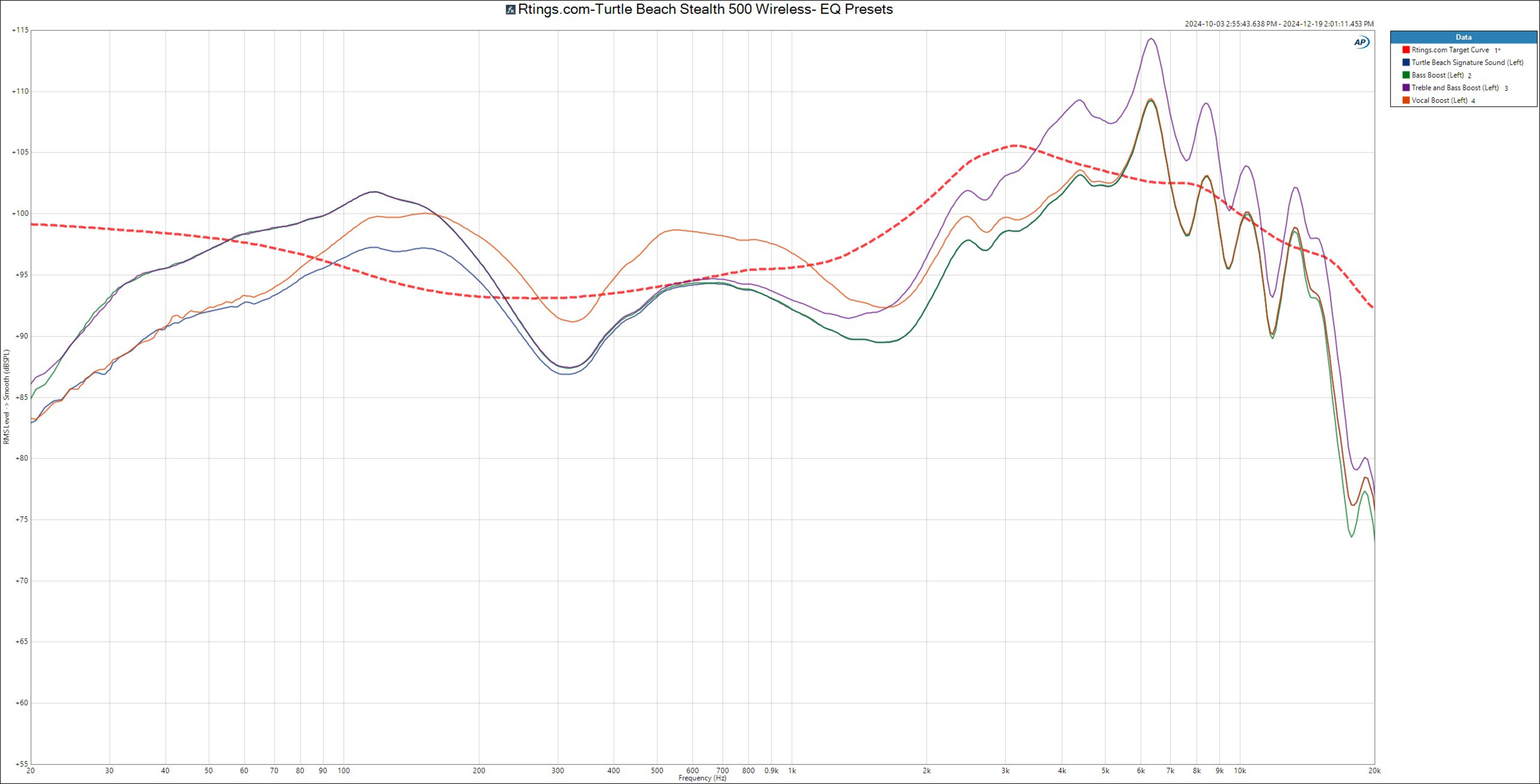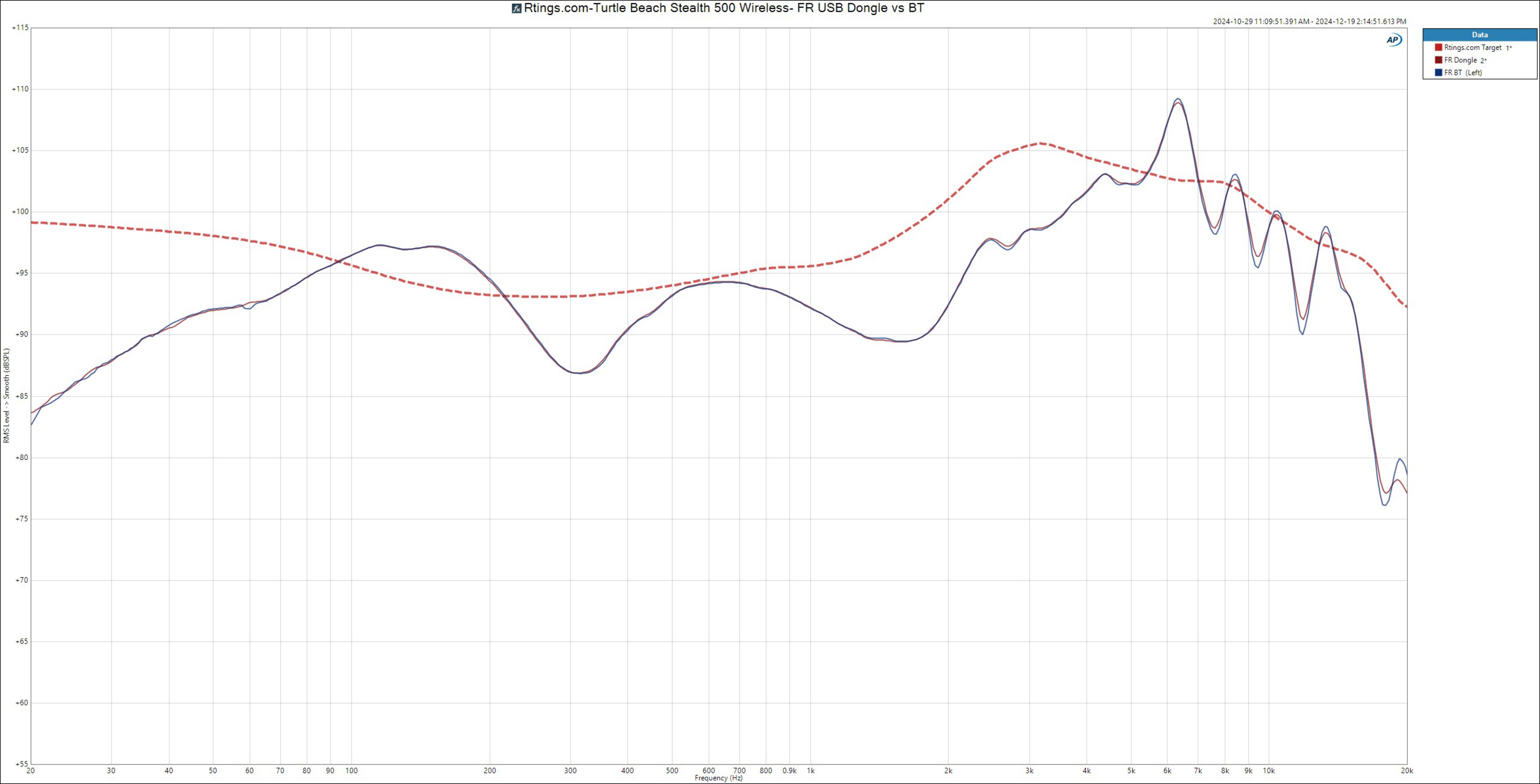 The Turtle Beach Stealth 500 have fair treble compliance. The dip in the low treble is a continuation of the dip in the high mids and leaves dialogue sounding a bit recessed and hard to discern clearly, especially in busy combat scenes. By contrast, the mid-treble is slightly boosted, giving vocals and effects presence, though a narrow peak in this region can make sibilants sound harsh.