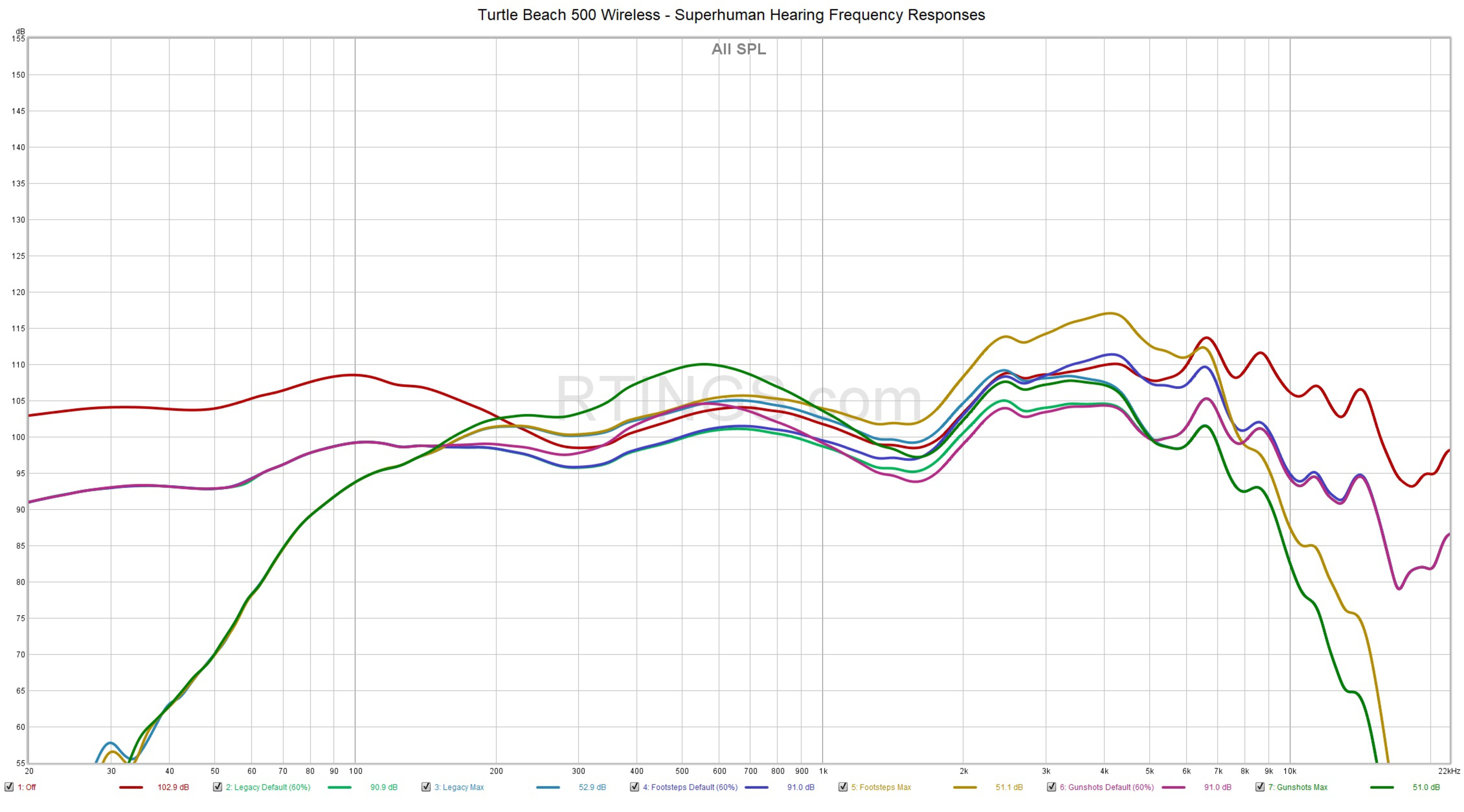 These headphones have a virtually identical frequency response whether connected via Bluetooth or their dongle, but activating the microphone shelves off the highest treble frequencies. We tested these headphones using the Turtle Beach Signature Sound preset, but you can change the sound of these headphones using EQ presets or various Superhuman Hearing functions. Superhuman Hearing provides several different presets, like 'Gunshots' or 'Footsteps,' which are designed to help FPS gamers better hear enemy movements. Whether you find the feature useful is a matter of personal preference, but it's worth noting that, when set to max, it makes the already poor bass response even worse.