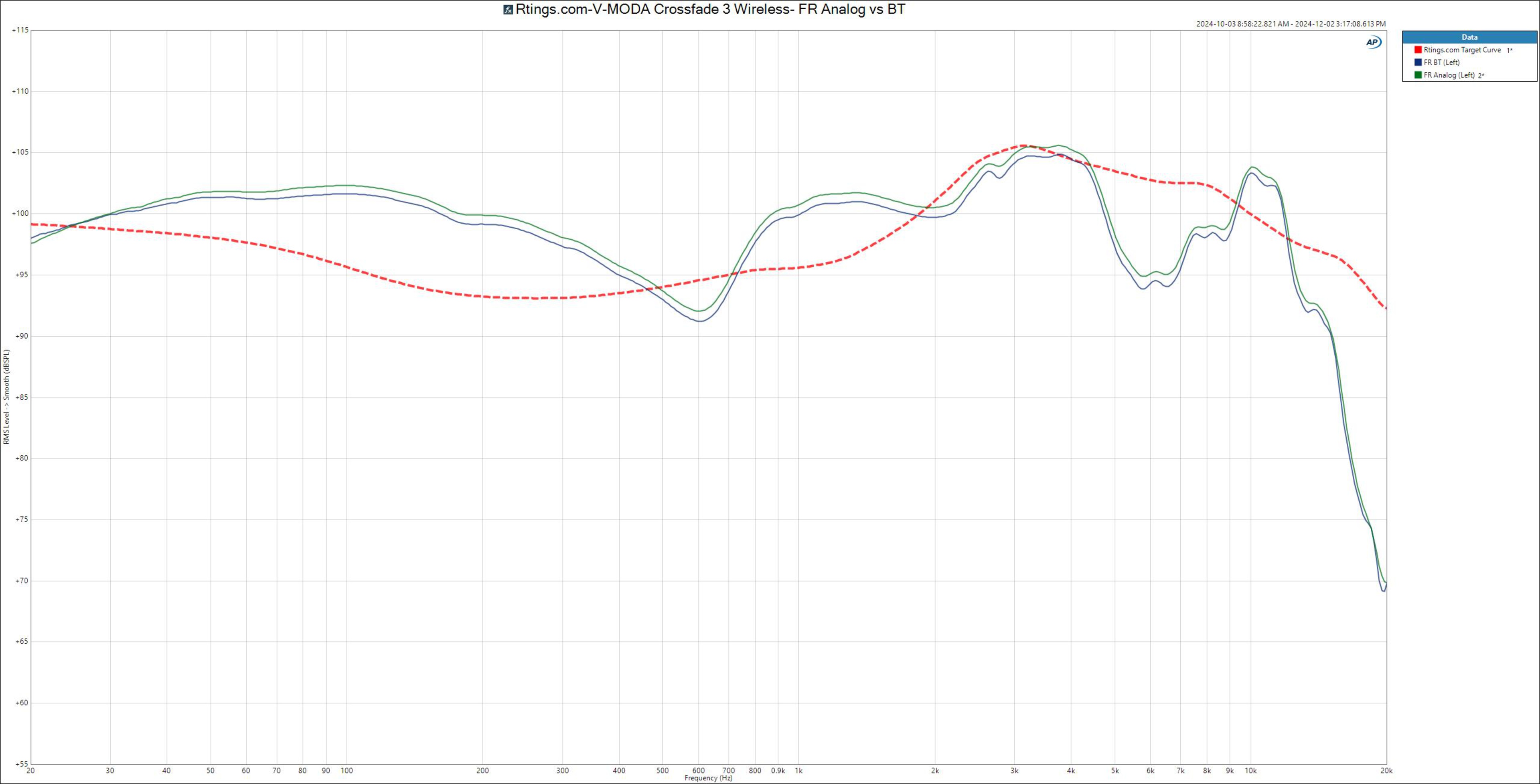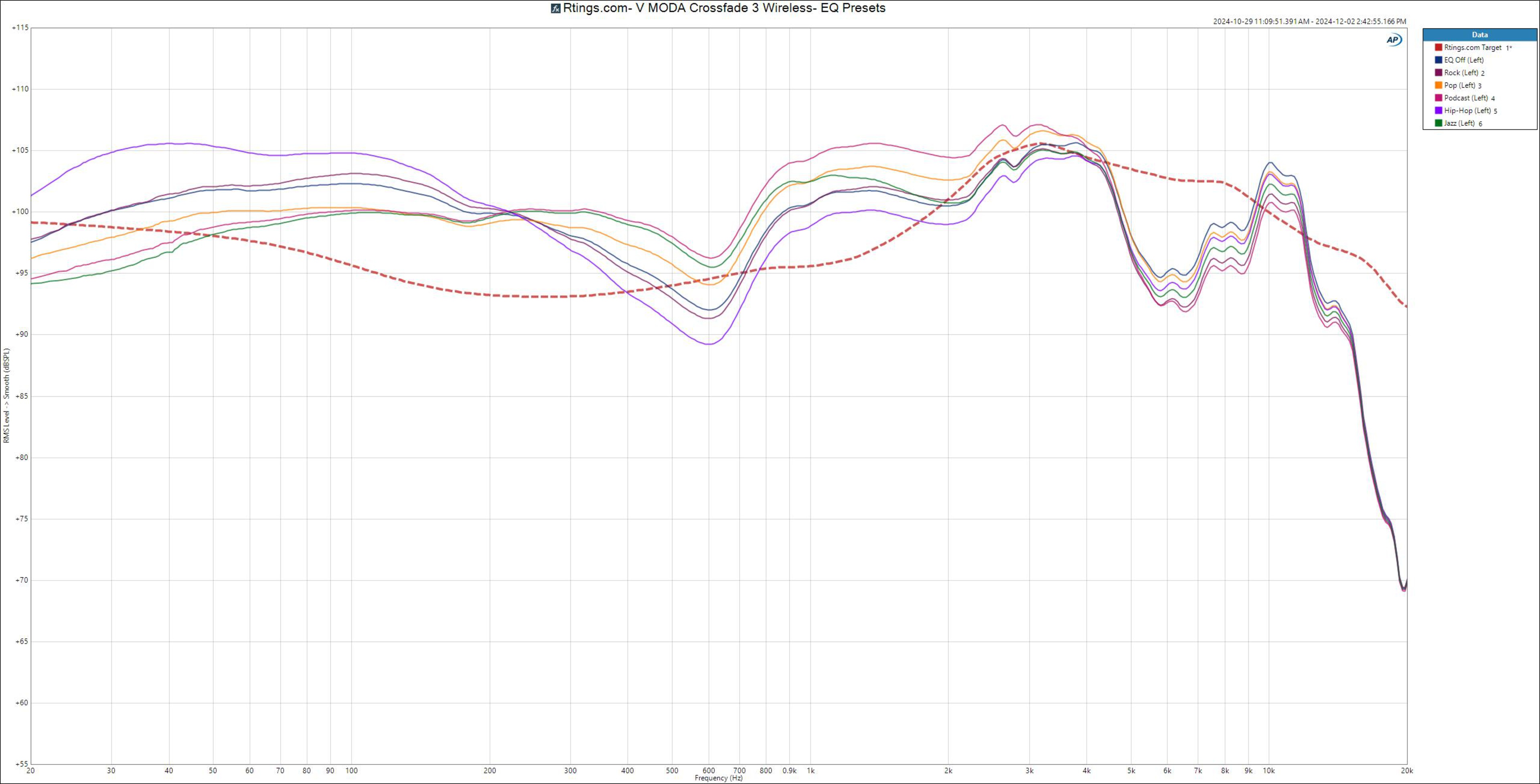 The V-MODA Crossfade 3 have mediocre frequency response consistency. Since frequency response consistency determines how well headphones sound on different people and between wears, it's one key component in the experience that can account for perceptual differences between people with the same headphones. These demonstrate a fairly dramatic deviation if your hair is long or you wear glasses. With glasses that break the over-ear seal, bass is reduced. Meanwhile, people with long hair can perceive elevated bass and mids.