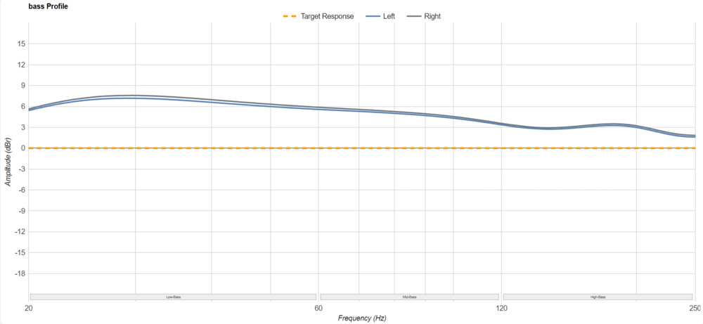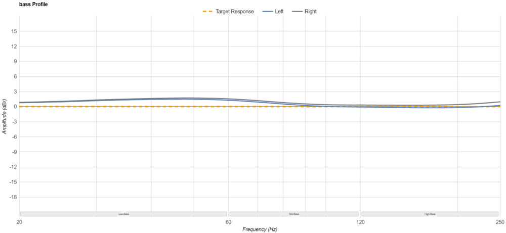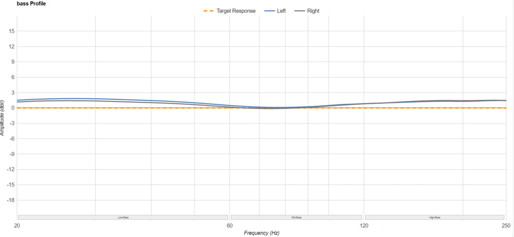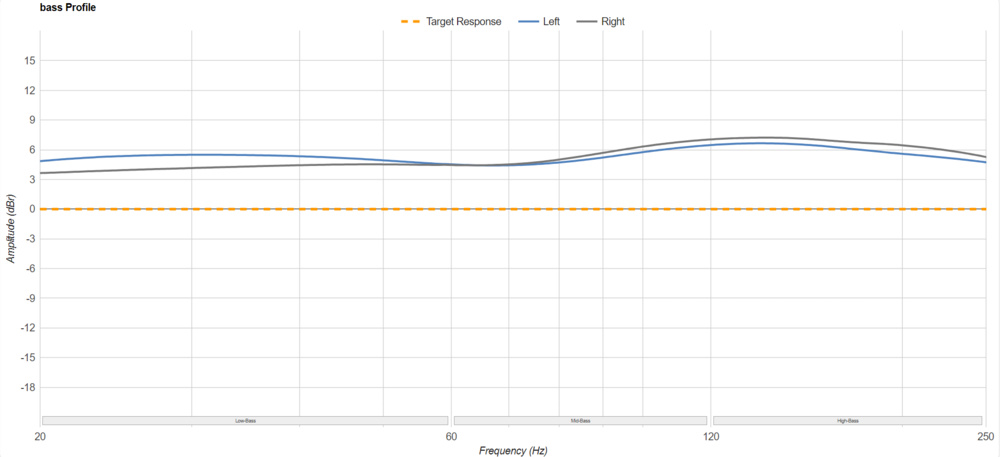 Since most of the thump and rumble in sound comes from the low-bass region, you may perceive headphones with a negative low-bass value as lacking this sound. Conversely, you may perceive headphones with a low-bass response above our target curve as having too much deep thump and rumble. Some users may prefer a bit of an elevated low bass since it could increase the headphones' visceral feel on certain tracks.