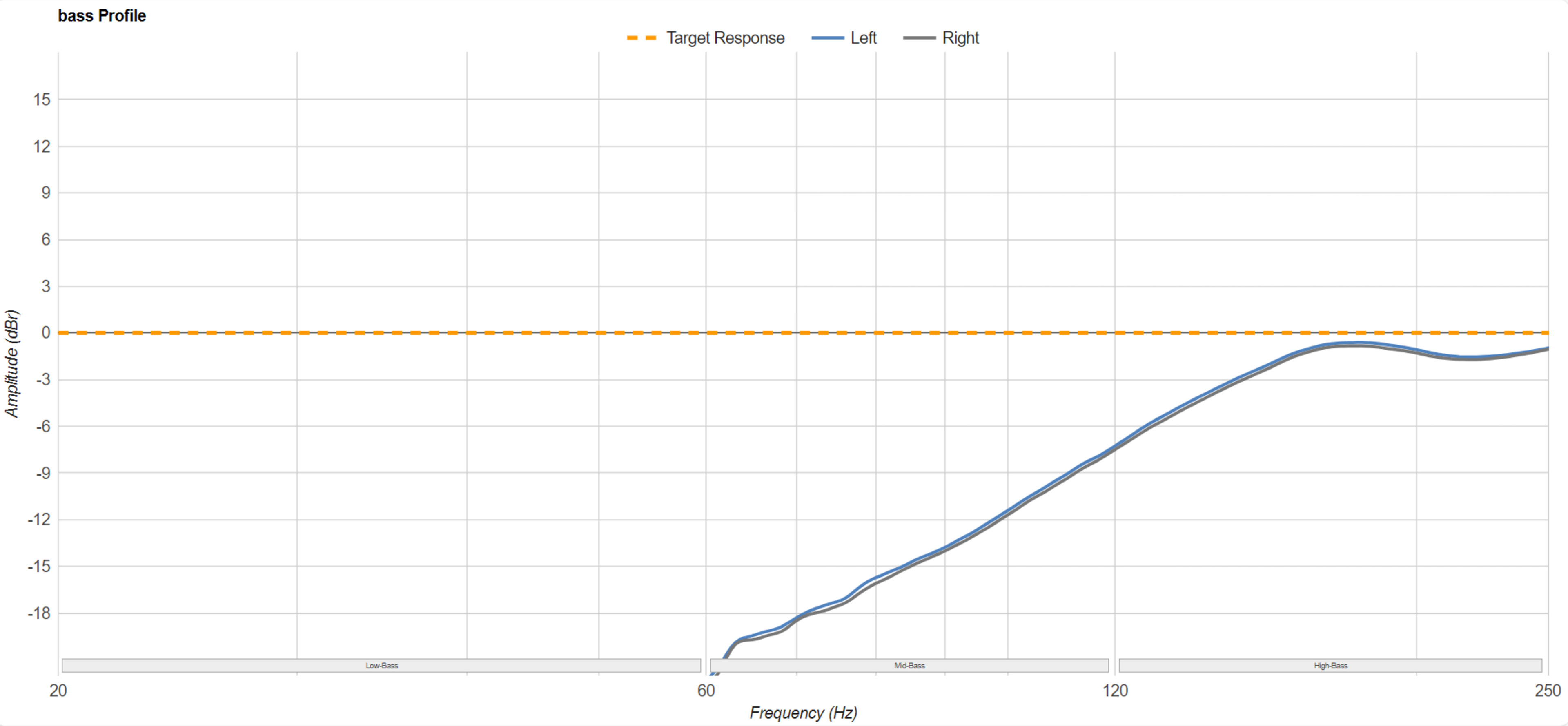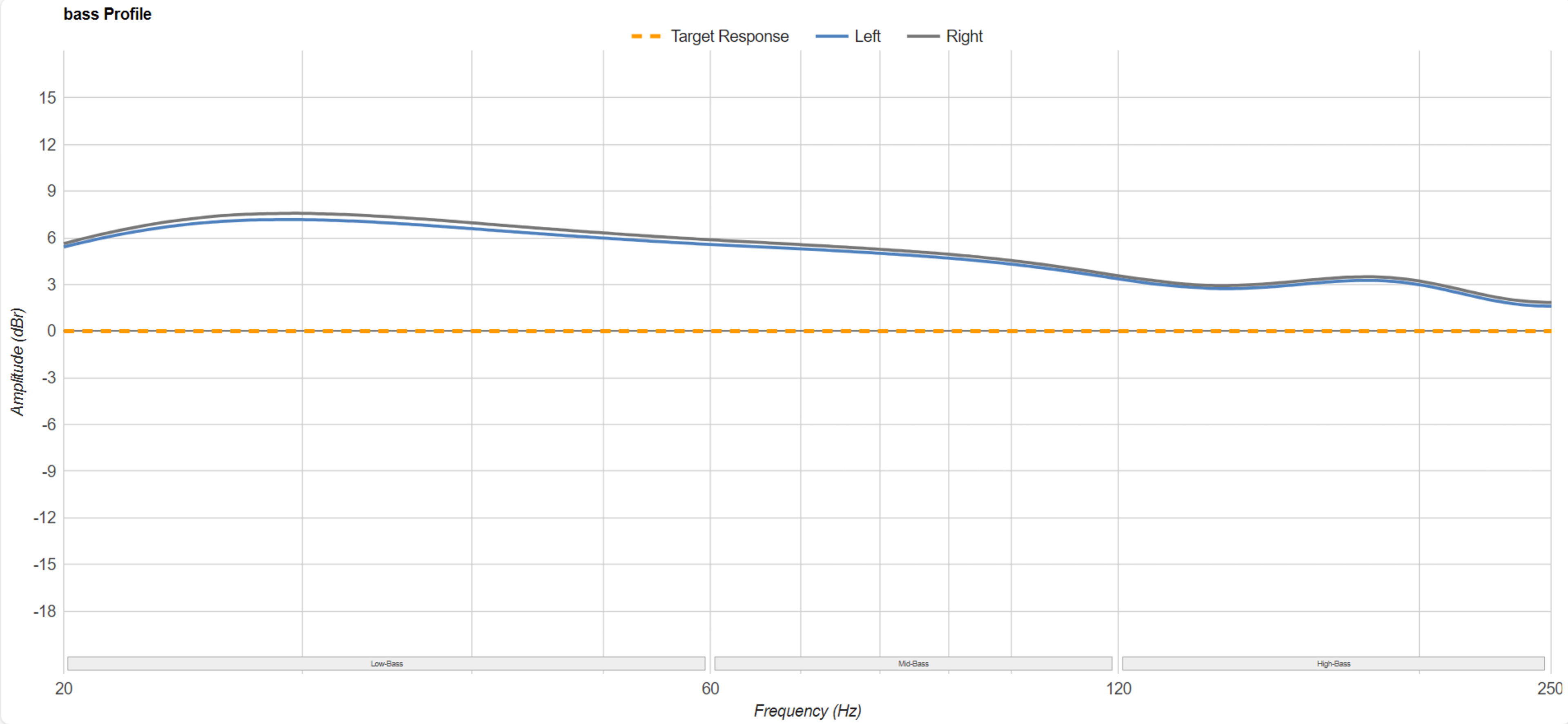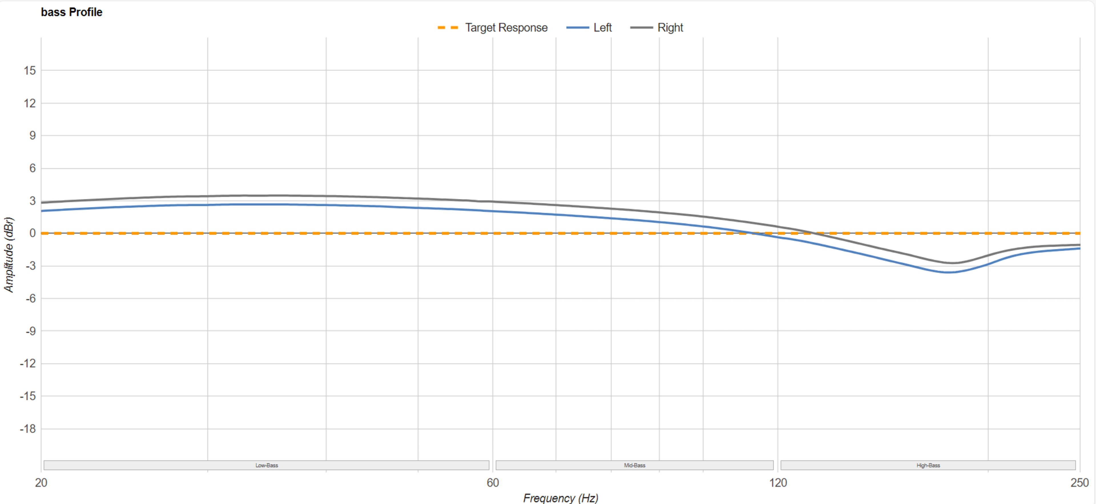 We calculate the low-bass value by averaging the amplitudes of each frequency within the low-bass region. We then report the final value relative to our target.
