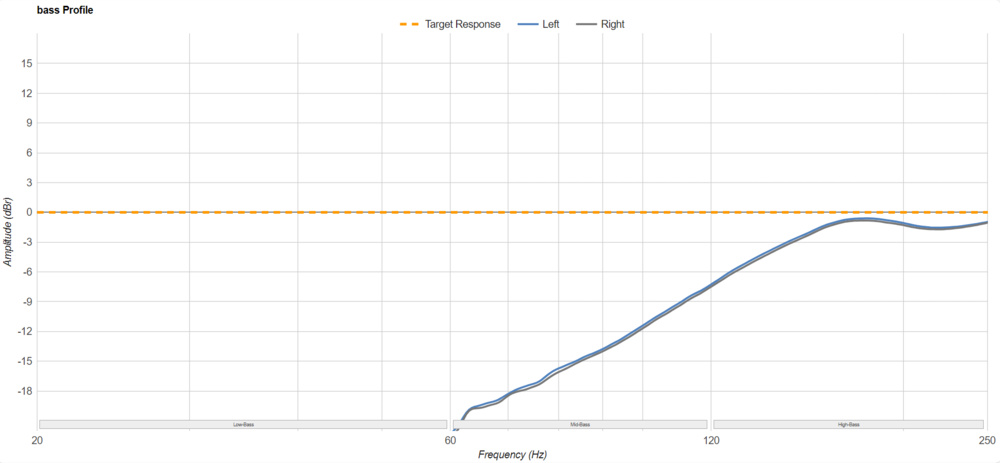 Since most of the thump and rumble in sound comes from the low-bass region, you may perceive headphones with a negative low-bass value as lacking this sound. Conversely, you may perceive headphones with a low-bass response above our target curve as having too much deep thump and rumble. Some users may prefer a bit of an elevated low bass since it could increase the headphones' visceral feel on certain tracks.